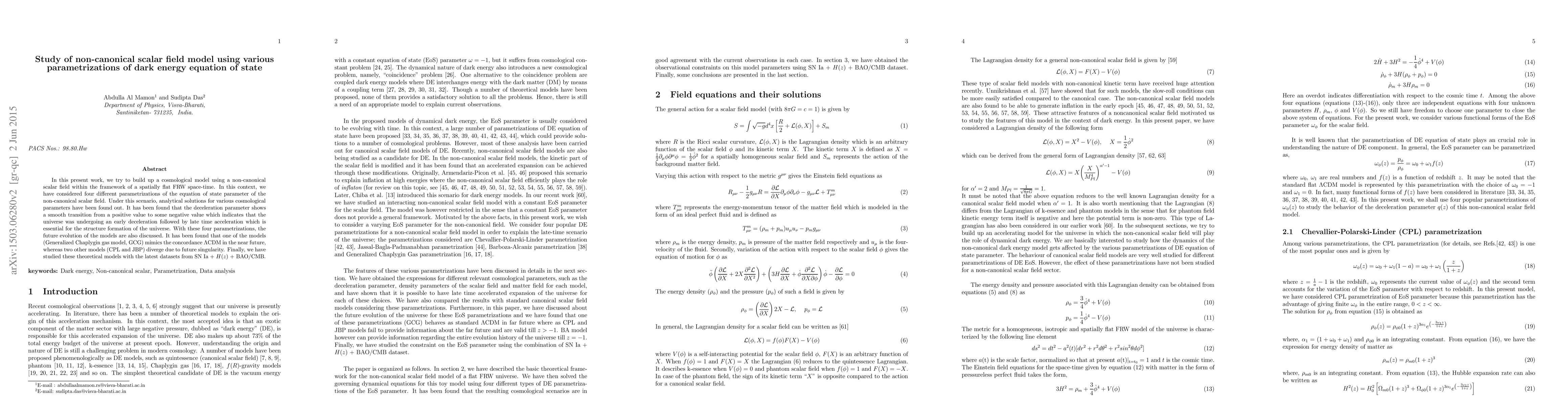 In this present work, we try to build up a cosmological model using a non-canonical scalar field within the framework of a spatially flat FRW space-time. In this context, we have considered four different parametrizations of the equation of state parameter of the non-canonical scalar field. Under this scenario, analytical solutions for various cosmological parameters have been found out. It has been found that the deceleration parameter shows a smooth transition from a positive value to some negative value which indicates that the universe was undergoing an early deceleration followed by late time acceleration which is essential for the structure formation of the universe. With these four parametrizations, the future evolution of the models are also discussed. It has been found that one of the models (Generalized Chaplygin gas model, GCG) mimics the concordance $\Lambda$CDM in the near future, whereas two other models (CPL and JBP) diverge due to future singularity. Finally, we have studied these theoretical models with the latest datasets from SN Ia $+$ $H(z)$ $+$ BAO/CMB.