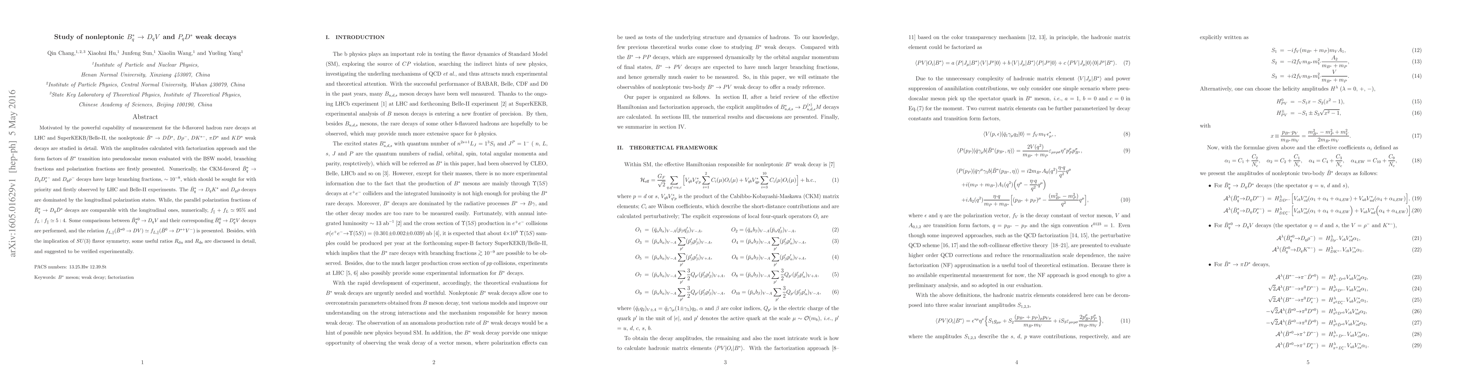 Motivated by the powerful capability of measurement for the $b$-flavored hadron rare decays at LHC and SuperKEKB/Belle-II, the nonleptonic $\bar{B}^{\ast}$ ${\to}$ $D\bar{D}^{\ast}$, $D{\rho^-}$, $DK^{\ast-}$, ${\pi}D^{\ast}$ and $KD^{\ast}$ weak decays are studied in detail. With the amplitudes calculated with factorization approach and the form factors of $B^{\ast}$ transition into pseudoscalar meson evaluated with the BSW model, branching fractions and polarization fractions are firstly presented. Numerically, the CKM-favored $\bar{B}_{q}^{\ast}$ ${\to}$ $D_{q}D_{s}^{{\ast}-}$ and $D_{q}{\rho}^{-}$ decays have large branching fractions, $\sim$ $10^{-8}$, which should be sought for with priority and firstly observed by LHC and Belle-II experiments. The $\bar{B}^{\ast}_q$ ${\to}$ $D_qK^{\ast}$ and $D_q{\rho}$ decays are dominated by the longitudinal polarization states. While, the parallel polarization fractions of $\bar{B}^{\ast}_q$ ${\to}$ $D_q\bar{D}^{\ast}$ decays are comparable with the longitudinal ones, numerically, $f_{\parallel}$ $+$ $f_{L}$ ${\simeq}$ 95\% and $f_{L}:f_{\parallel}$ $\simeq$ $5:4$. Some comparisons between $\bar{B}^{*0}_q$ $\to$ $D_q V$ and their corresponding $\bar{B}^{0}_q$ $\to$ $D^*_q V$ decays are performed, and the relation $ f_{L,\parallel}(\bar{B}^{\ast 0}\to D V)\simeq f_{L,\parallel}(\bar{B}^0\to D^{\ast +} V^-) $ is presented. Besides, with the implication of $SU(3)$ flavor symmetry, some useful ratios $ R_{\rm du}$ and $ R_{\rm ds}$ are discussed in detail, and suggested to be verified experimentally.