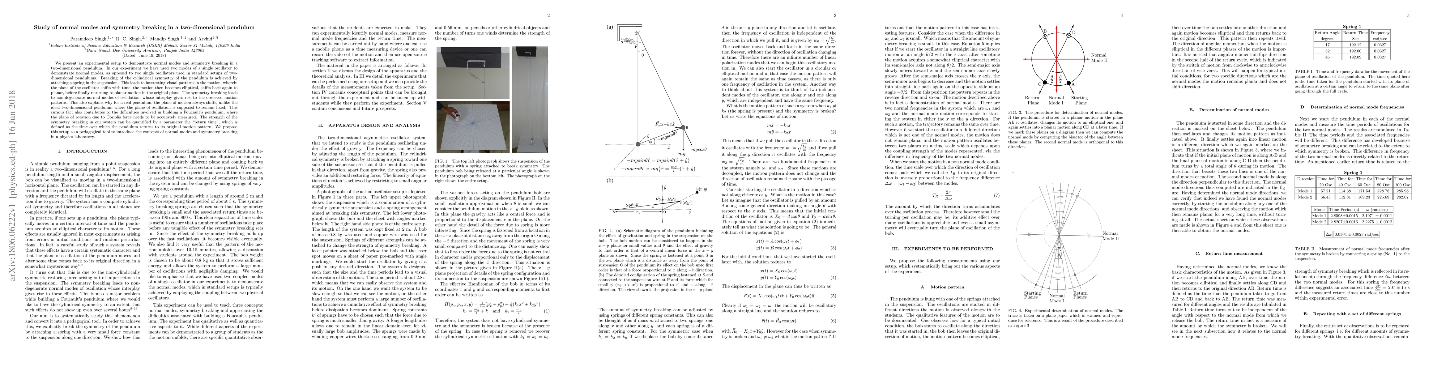This study demonstrates normal modes and symmetry breaking in a two-dimensional pendulum using a single oscillator with an attached spring, leading to elliptical and shifting planar motion patterns. The setup provides a visual and quantitative pedagogical tool for understanding these concepts.