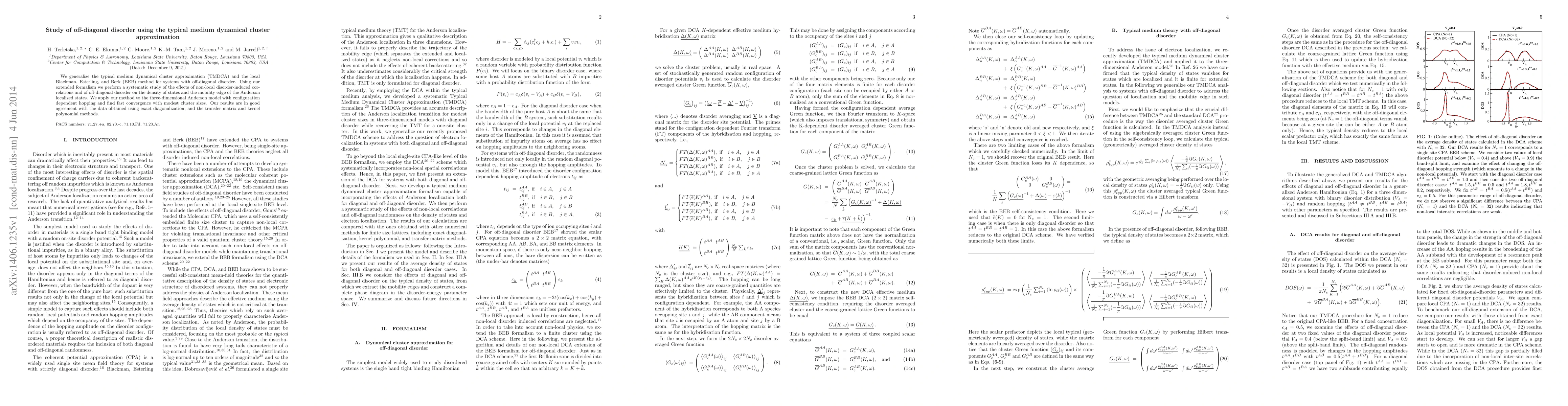 This paper generalizes the typical medium dynamical cluster approximation (TMDCA) to study off-diagonal disorder in systems, analyzing its effects on density of states and mobility edge. Results show good agreement with exact diagonalization and other methods, indicating fast convergence with modest cluster sizes.