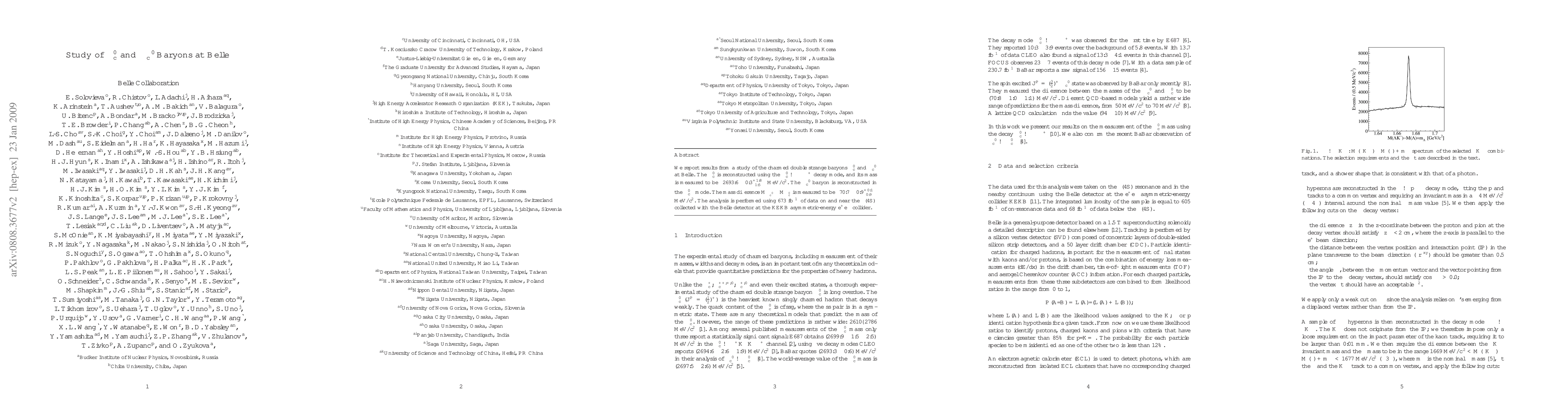 This study at Belle measures the masses of the charmed double strange baryons \Omega_c^0 and \Omega_c^{*0}, finding the former to have a mass of (2693.6 ± 0.3 {+1.8 \atop -1.5}) MeV/c^2 and the mass difference between the two baryons to be (70.7 ± 0.9 {+0.1 \atop -0.9}) MeV/c^2. The analysis utilized 673 fb^{-1} of data collected at the KEKB collider.
