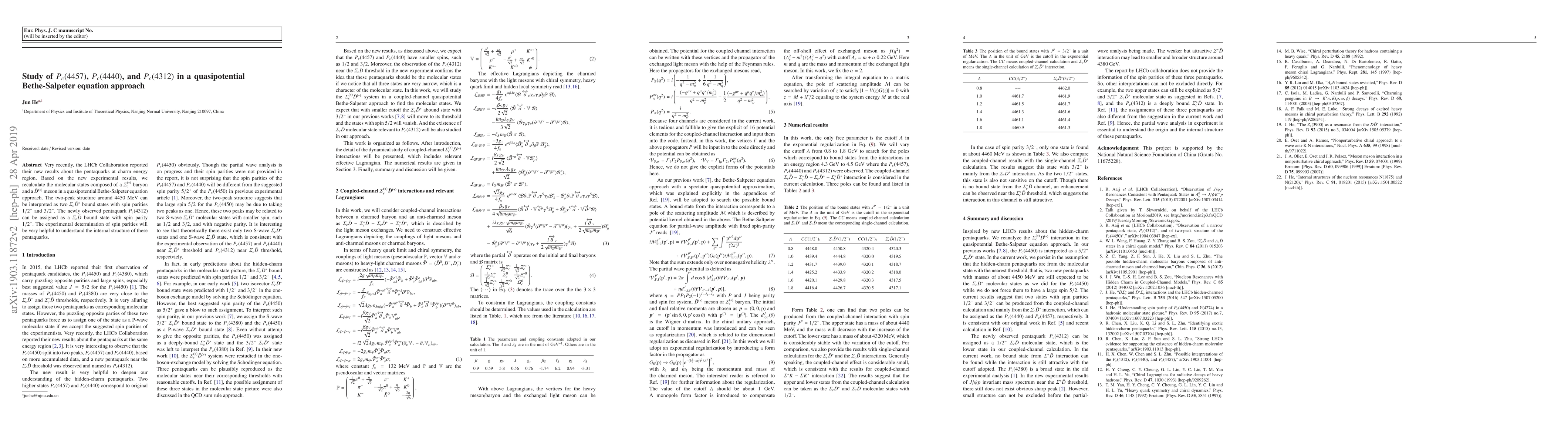 Very recently, the LHCb Collaboration reported their new results about the pentaquarks at charm energy region. Based on the new experimental results, we recalculate the molecular states composed of a $\Sigma_c^{(*)}$ baryon and a $\bar{D}^{(*)}$ meson in a quasipotential Bethe-Salpeter equation approach. The two-peak structure around 4450 MeV can be interpreted as two $\Sigma_c \bar{D}^*$ bound states with spin parities $1/2^-$ and $3/2^-$. The newly observed pentaquark $P_c(4312)$ can be assigned as a $\Sigma_c\bar{D}$ bound state with spin parity $1/2^-$. The experimental determination of spin parities will be very helpful to understand the internal structure of these pentaquarks.