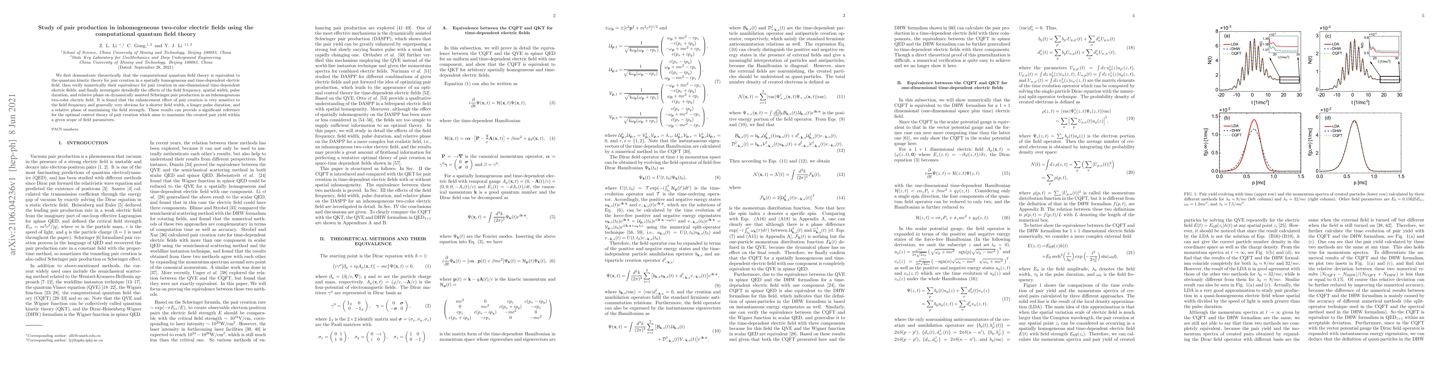 This study uses computational quantum field theory to demonstrate the equivalence of quantum kinetic theory for pair creation in electric fields and investigates the effects of field frequency, spatial width, pulse duration, and relative phase on Schwinger pair production in inhomogeneous two-color electric fields, finding significant enhancement sensitivity to these parameters. These insights are crucial for optimizing pair creation in controlled field conditions.