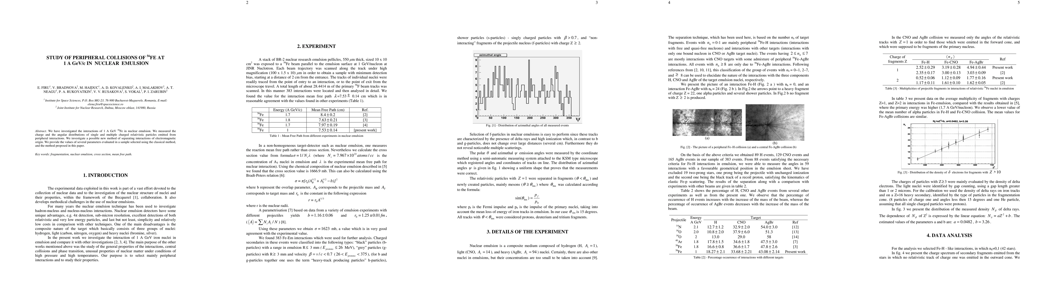 The study examines 1 A GeV 56Fe peripheral collisions in nuclear emulsion, measuring charge and angular distributions of relativistic particles. It proposes a novel method for distinguishing electromagnetic interaction types, comparing it with a classical method, and presents parameter values derived from both techniques.