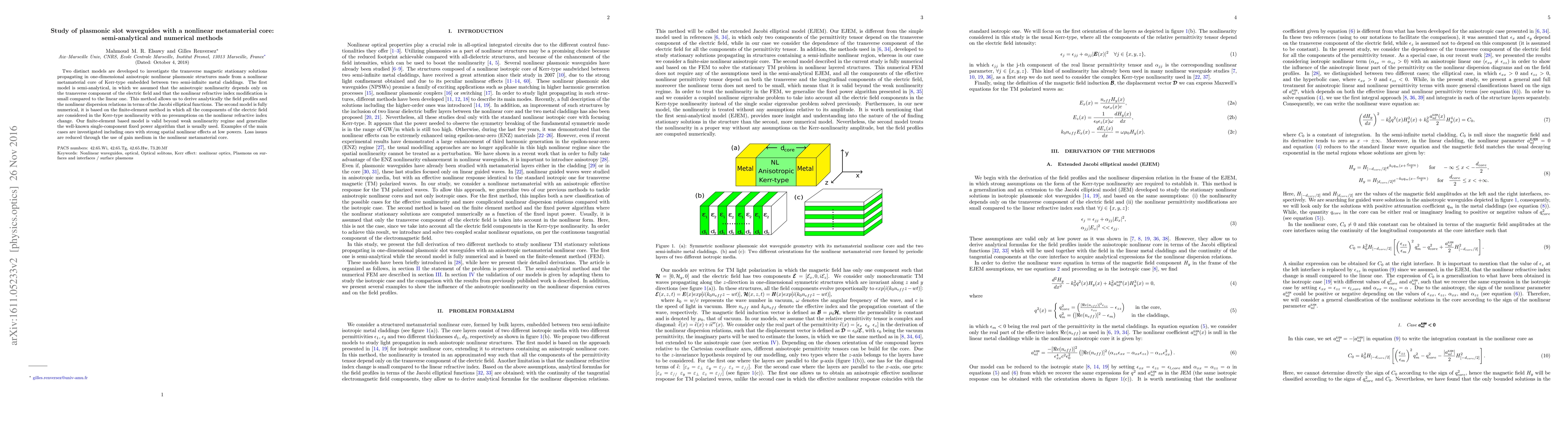 This paper develops two models to study the propagation of transverse magnetic waves in nonlinear plasmonic slot waveguides with a Kerr-type metamaterial core: a semi-analytical model using Jacobi elliptical functions and a numerical finite-element method, both addressing strong nonlinear effects beyond weak nonlinearity regimes.