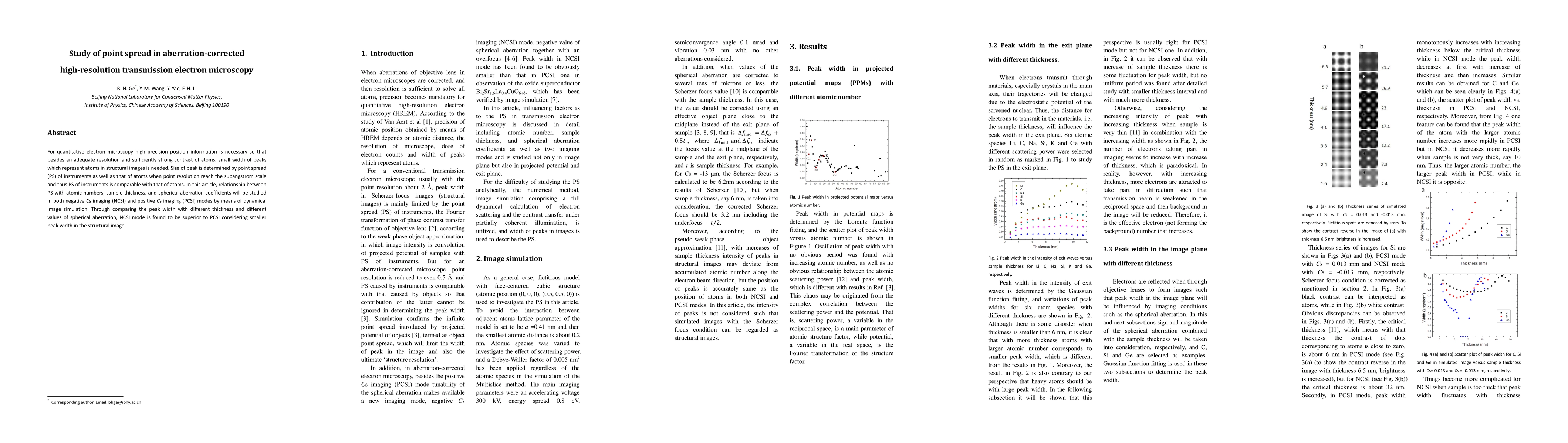 This study investigates the point spread function (PS) in aberration-corrected high-resolution transmission electron microscopy, focusing on its relationship with atomic numbers, sample thickness, and spherical aberration coefficients. The research finds that negative Cs imaging (NCSI) mode provides a smaller peak width compared to positive Cs imaging (PCSI) mode, enhancing structural image resolution.