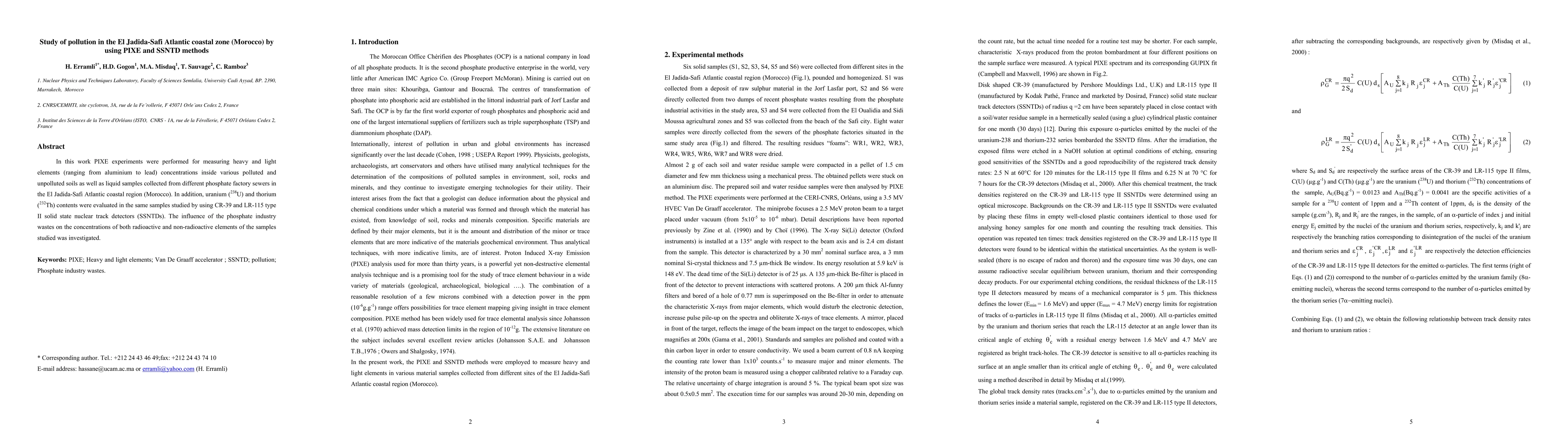 In this work PIXE experiments were performed for measuring heavy and light elements (ranging from aluminium to lead) concentrations inside various polluted and unpolluted soils as well as liquid samples collected from different phosphate factory sewers in the El Jadida-Safi Atlantic coastal region (Morocco). In addition, uranium (238U) and thorium (232Th) contents were evaluated in the same samples studied by using CR-39 and LR-115 type II solid state nuclear track detectors (SSNTDs). The influence of the phosphate industry wastes on the concentrations of both radioactive and non-radioactive elements of the samples studied was investigated.