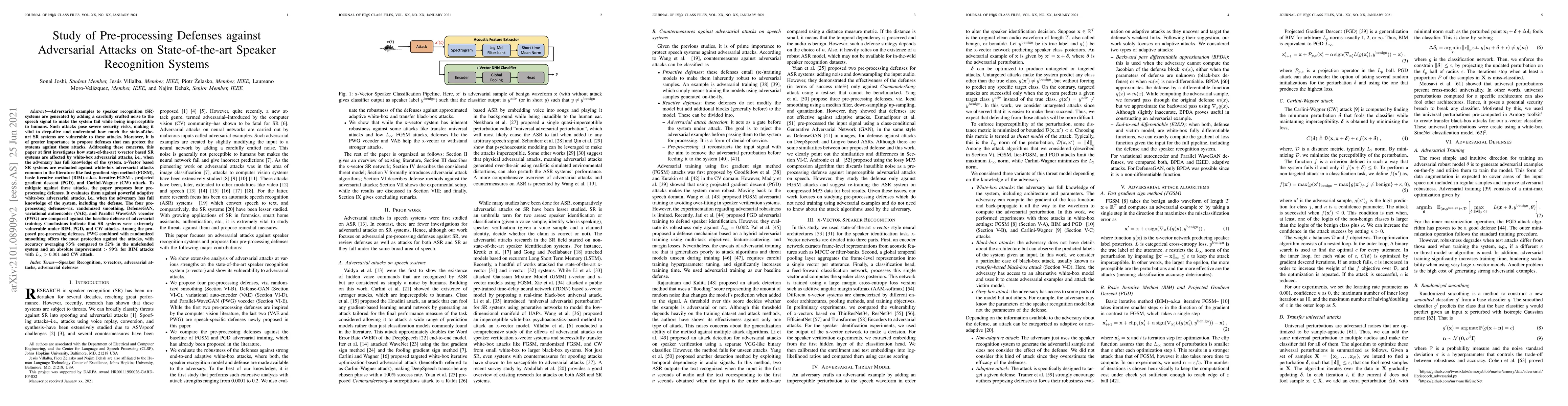 This paper investigates the vulnerability of state-of-the-art x-vector based speaker recognition systems to white-box adversarial attacks and proposes four pre-processing defenses, finding that Parallel WaveGAN vocoder combined with randomized smoothing offers the best protection, achieving an accuracy of 93% compared to 52% in the undefended system.
