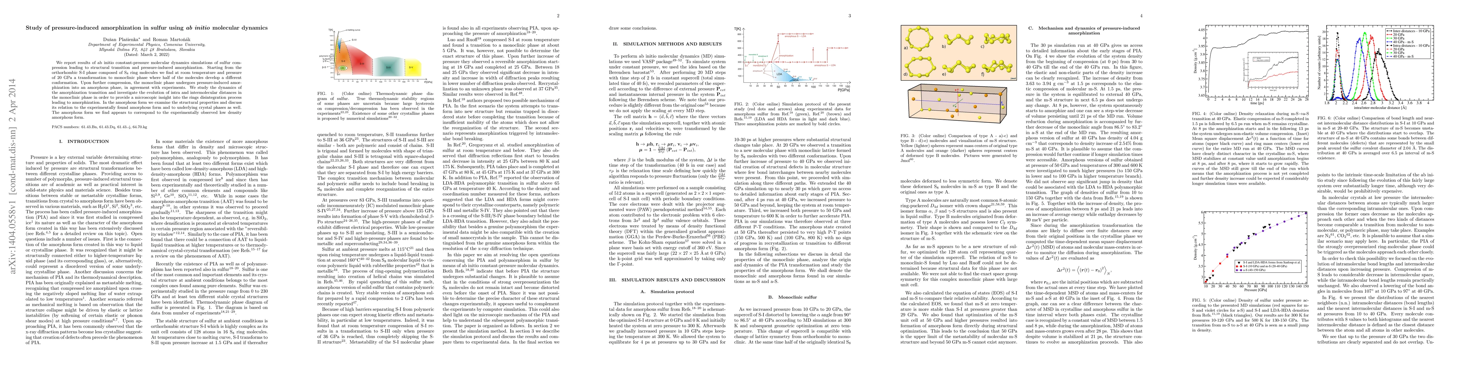 This study uses ab initio molecular dynamics to simulate sulfur's structural transition under pressure, revealing amorphization at 20 GPa. The amorphous form matches the experimentally observed low-density amorphous sulfur, providing insights into the disintegration process from its crystalline phases.