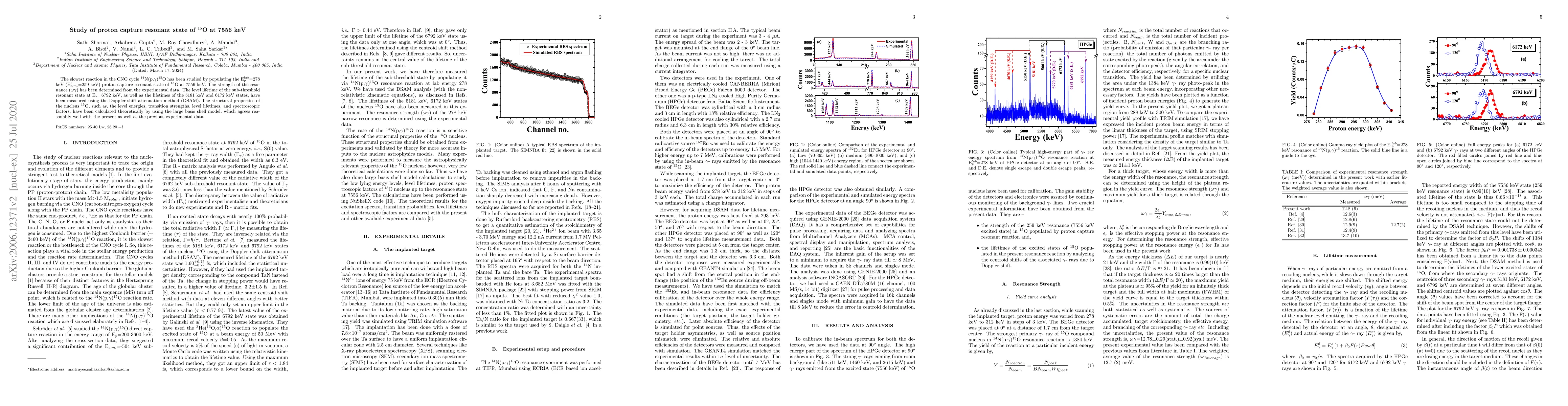 Researchers studied the proton capture resonance state of ^{15}O at 7556 keV to determine its strength and measure level lifetimes. Theoretical calculations using the large basis shell model agreed reasonably well with experimental data.
