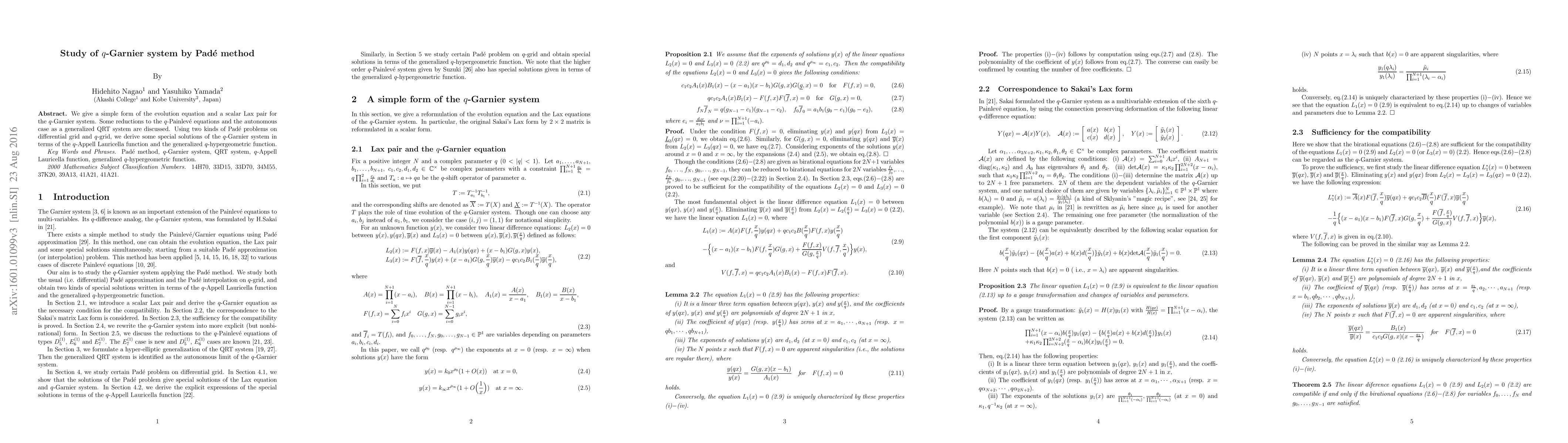 We give a simple form of the evolution equation and a scalar Lax pair for the $q$-Garnier system. Some reductions to the $q$-Painlev\'e equations and the autonomous case as a generalized QRT system are discussed. Using two kinds of Pad\'e problems on differential grid and $q$-grid, we derive some special solutions of the $q$-Garnier system in terms of the $q$-Appell Lauricella function and the generalized $q$-hypergeometric function.