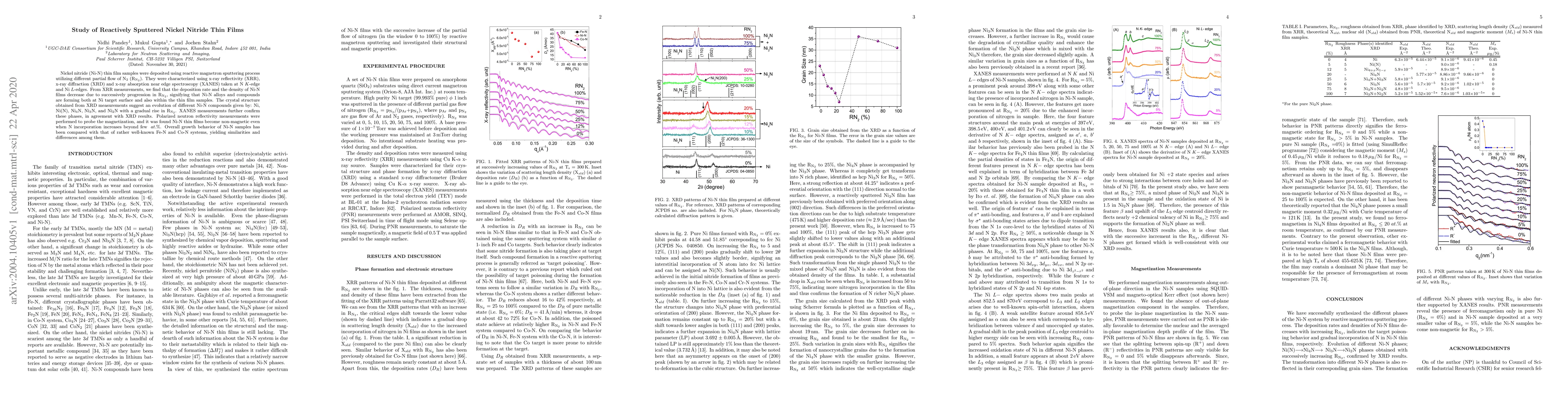Nickel nitride thin films were created via sputtering with varying N2 flow, resulting in diverse Ni-N compounds from XRR, XRD, and XANES analysis. The films transitioned from magnetic to non-magnetic as N incorporation increased, paralleling Fe-N and Co-N systems' growth patterns.