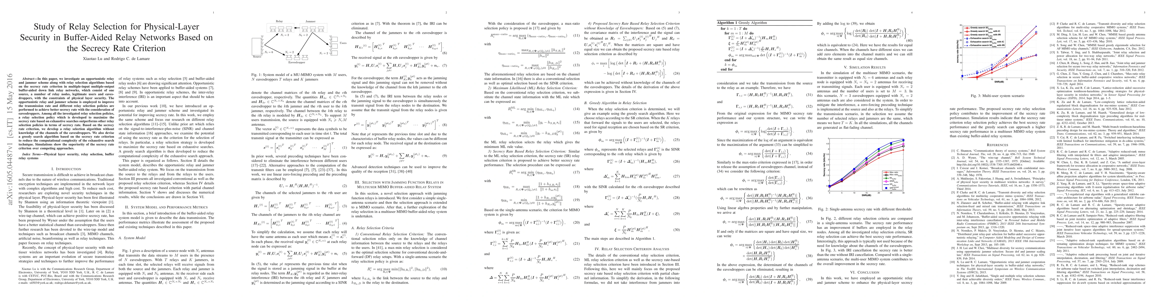 In this paper, we investigate an opportunistic relay and jammer scheme along with relay selection algorithms based on the secrecy rate criterion in multiple-input multiple-output buffer-aided down link relay networks, which consist of one source, a number of relay nodes, legitimate users and eavesdroppers, with the constraints of physical layer security. The opportunistic relay and jammer scheme is employed to improve the transmission rate and different relay selection policies are performed to achieve better secrecy rate with the consideration of eavesdroppers. Among all the investigated relay selection policies, a relay selection policy which is developed to maximize the secrecy rate based on exhaustive searches outperforms other relay selection policies in terms of secrecy rate. Based on the secrecy rate criterion, we develop a relay selection algorithm without knowledge of the channels of the eavesdroppers. We also devise a greedy search algorithm based on the secrecy rate criterion to reduce the computational complexity of the exhaustive search technique. Simulations show the superiority of the secrecy rate criterion over competing approaches.