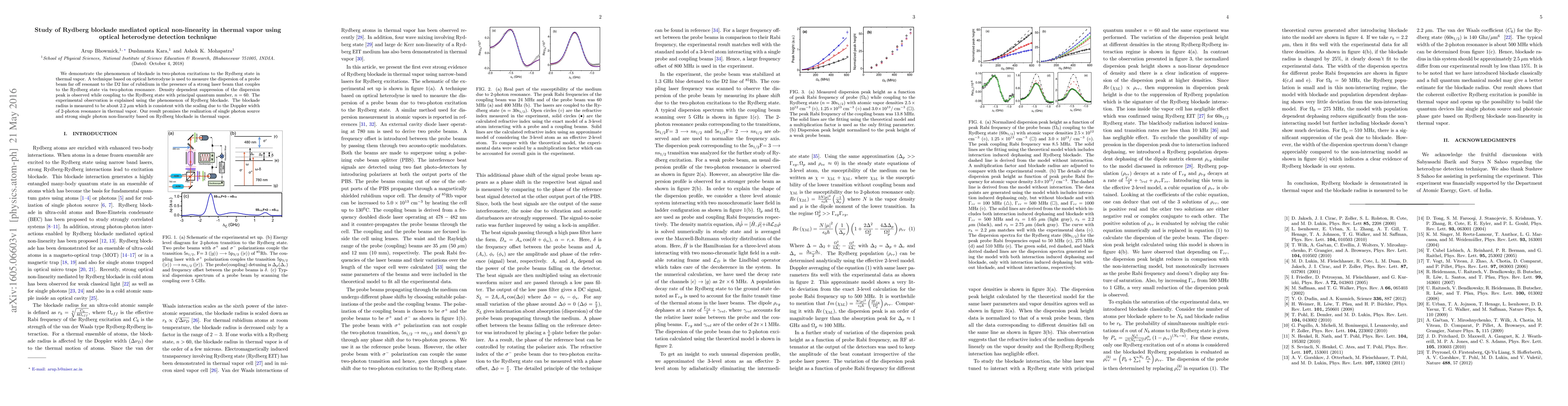 This study demonstrates Rydberg blockade in thermal rubidium vapor using optical heterodyne detection, showing density-dependent suppression of probe beam dispersion due to two-photon excitations to a high Rydberg state (n = 60). The measured blockade radius of 2.2 μm aligns with theoretical predictions based on Doppler width, indicating potential for single photon source and strong non-linearity.