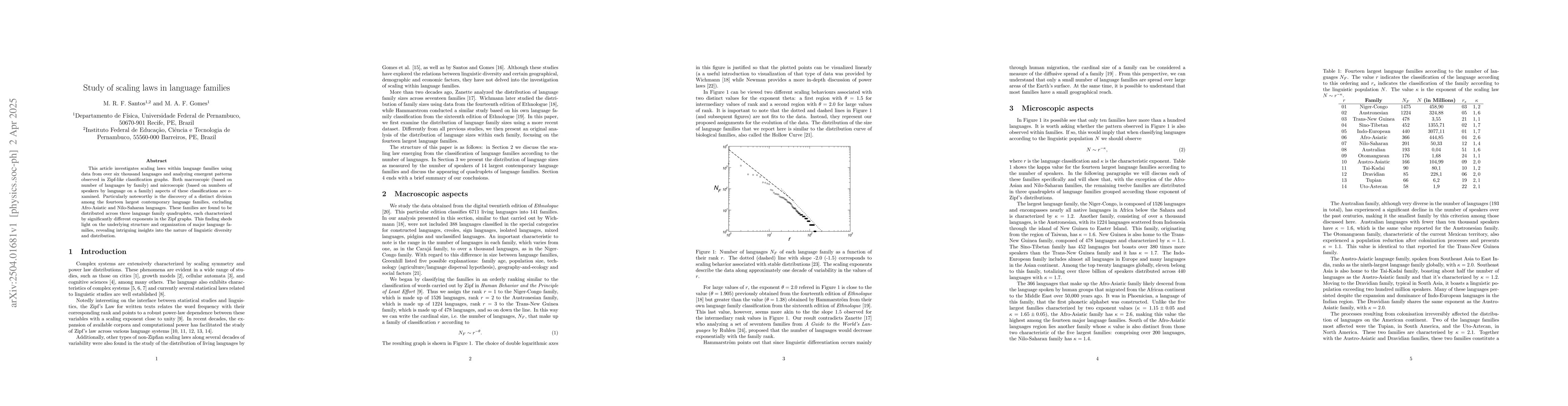 This work distinguishes itself by identifying unique scaling exponents within language family quadruplets, offering new insights into linguistic diversity and organization.