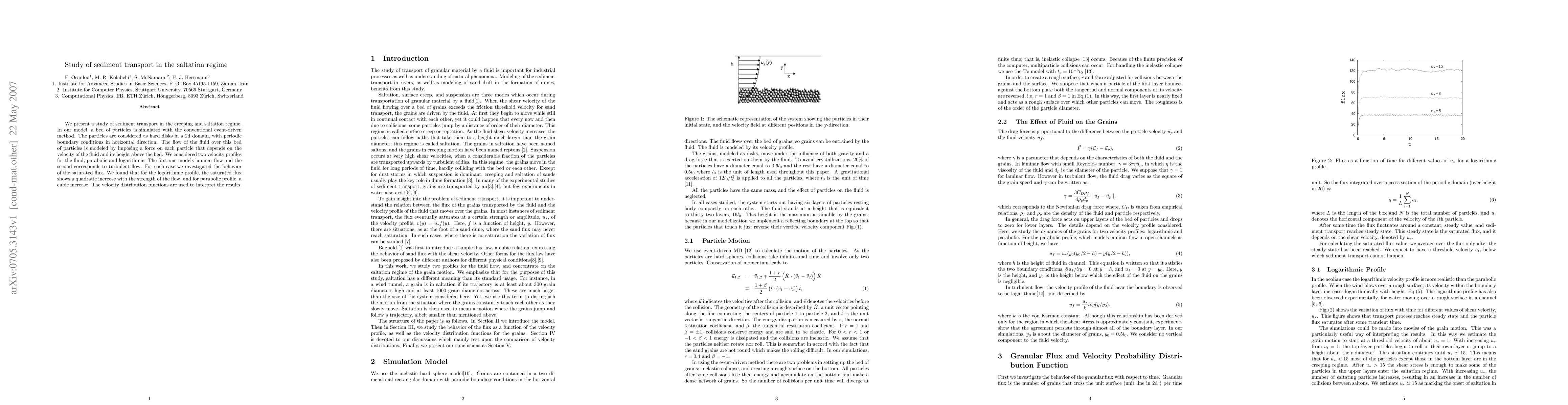 We present a study of sediment transport in the creeping and saltation regime. In our model, a bed of particles is simulated with the conventional event-driven method. The particles are considered as hard disks in a 2d domain, with periodic boundary conditions in horizontal direction. The flow of the fluid over this bed of particles is modeled by imposing a force on each particle that depends on the velocity of the fluid and its height above the bed. We considered two velocity profiles for the fluid, parabolic and logarithmic. The first one models laminar flow and the second corresponds to turbulent flow. For each case we investigated the behavior of the saturated flux. We found that for the logarithmic profile, the saturated flux shows a quadratic increase with the strength of the flow, and for parabolic profile, a cubic increase. The velocity distribution functions are used to interpret the results.