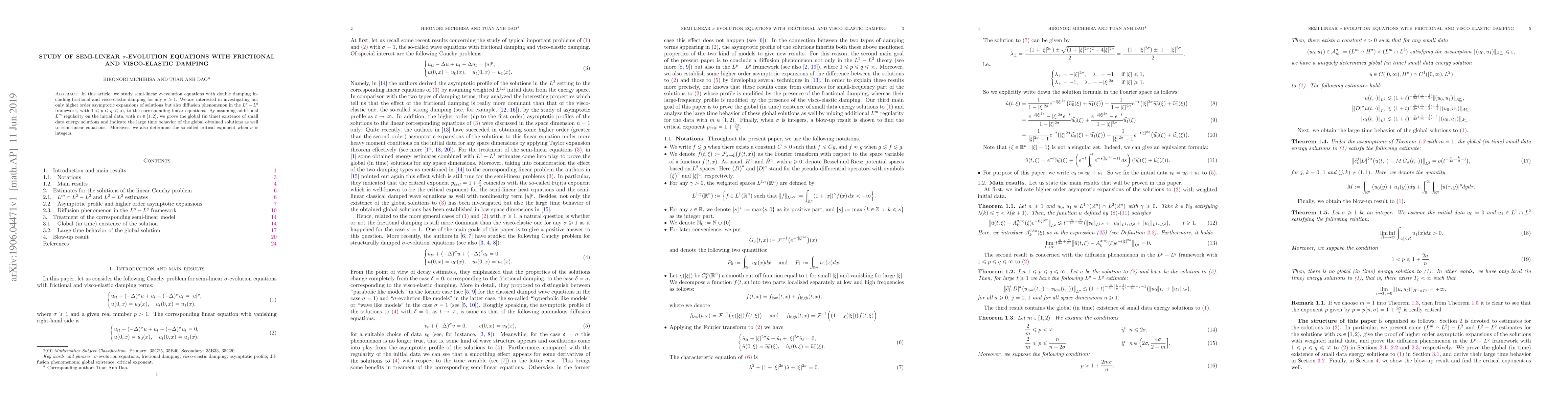 This paper investigates semi-linear $\sigma$-evolution equations with frictional and visco-elastic damping, proving global existence of small data energy solutions and exploring their large time behavior. It also examines the diffusion phenomenon in the $L^p-L^q$ framework and determines the critical exponent for integer $\sigma$.