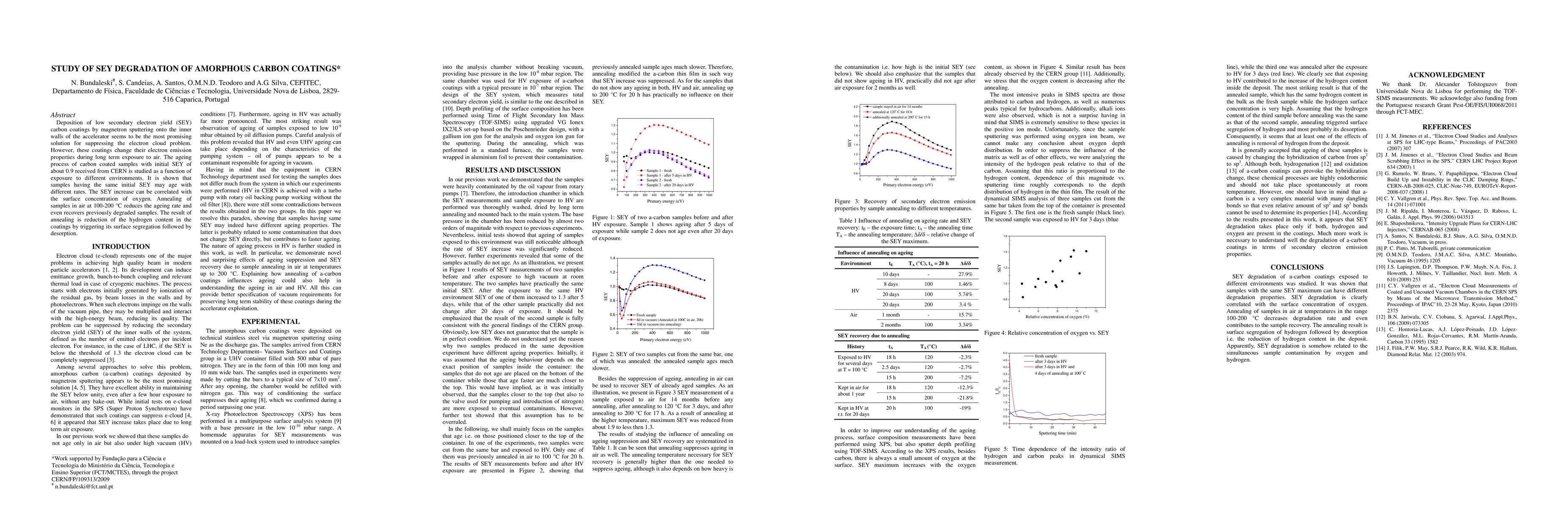 This study examines the degradation of low secondary electron yield (SEY) carbon coatings, deposited via magnetron sputtering, when exposed to various environments. The research reveals that coatings with similar initial SEY values age differently, with SEY increase correlating to oxygen concentration on the surface. Annealing in air at 100-200°C slows down degradation and can even restore degraded samples by reducing hydrogen content through surface segregation and desorption.
