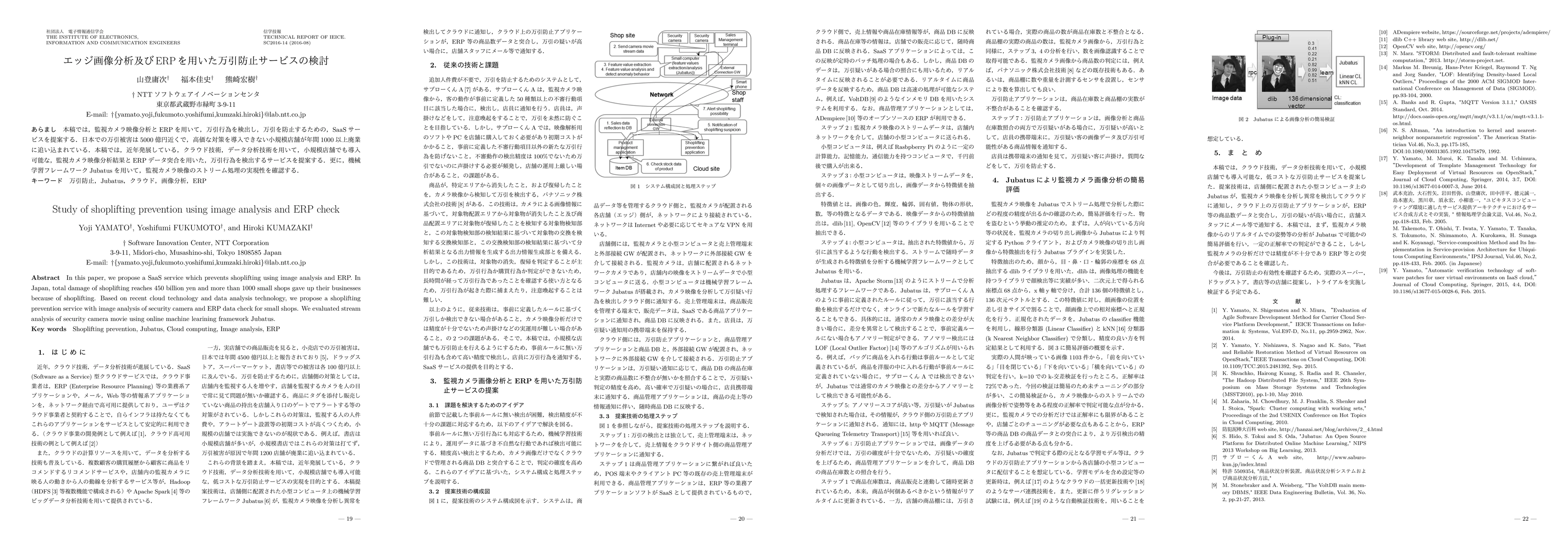 This paper proposes a shoplifting prevention service using image analysis of security cameras and ERP data check to help small shops in Japan prevent significant financial losses. It evaluates the effectiveness of stream analysis using online machine learning framework Jubatus.