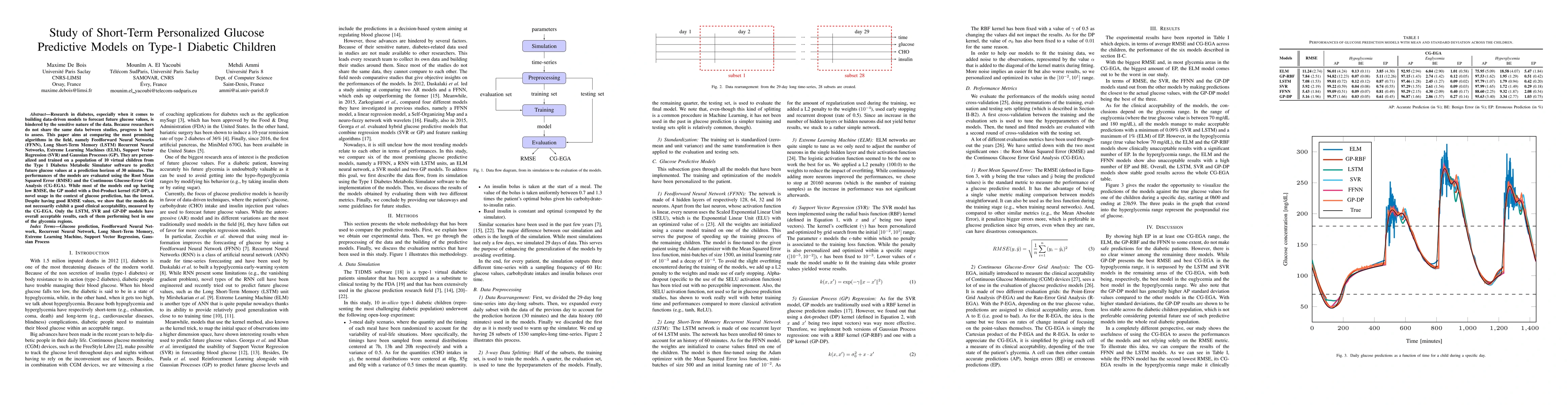 Research in diabetes, especially when it comes to building data-driven models to forecast future glucose values, is hindered by the sensitive nature of the data. Because researchers do not share the same data between studies, progress is hard to assess. This paper aims at comparing the most promising algorithms in the field, namely Feedforward Neural Networks (FFNN), Long Short-Term Memory (LSTM) Recurrent Neural Networks, Extreme Learning Machines (ELM), Support Vector Regression (SVR) and Gaussian Processes (GP). They are personalized and trained on a population of 10 virtual children from the Type 1 Diabetes Metabolic Simulator software to predict future glucose values at a prediction horizon of 30 minutes. The performances of the models are evaluated using the Root Mean Squared Error (RMSE) and the Continuous Glucose-Error Grid Analysis (CG-EGA). While most of the models end up having low RMSE, the GP model with a Dot-Product kernel (GP-DP), a novel usage in the context of glucose prediction, has the lowest. Despite having good RMSE values, we show that the models do not necessarily exhibit a good clinical acceptability, measured by the CG-EGA. Only the LSTM, SVR and GP-DP models have overall acceptable results, each of them performing best in one of the glycemia regions.