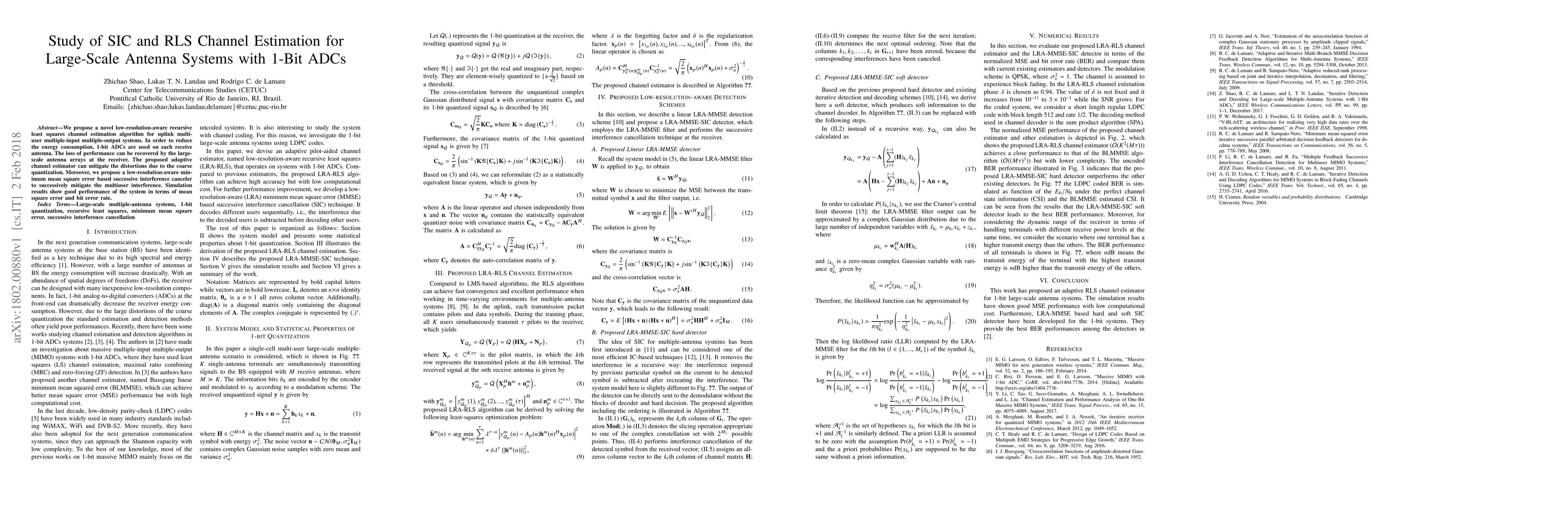 This paper proposes a novel recursive least squares channel estimation algorithm for multi-user MIMO systems using 1-bit ADCs, aiming to reduce energy consumption. It also introduces a successive interference canceler to mitigate multiuser interference, demonstrating effective performance recovery in simulations.