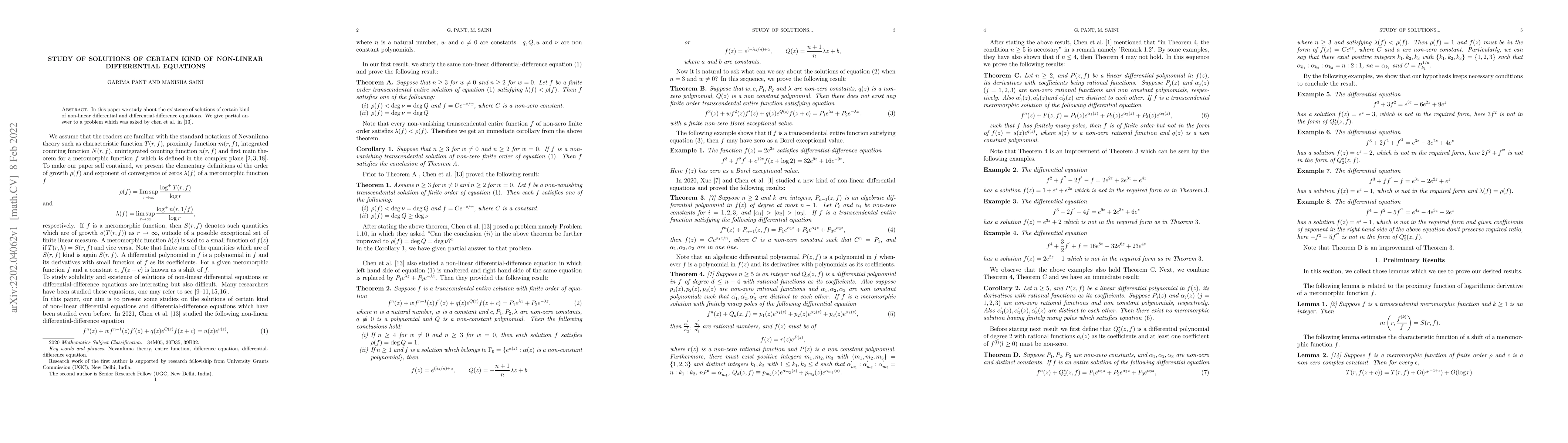 This paper investigates the existence of solutions for specific non-linear differential and differential-difference equations, providing a partial resolution to a question posed by Chen et al. in [13].
