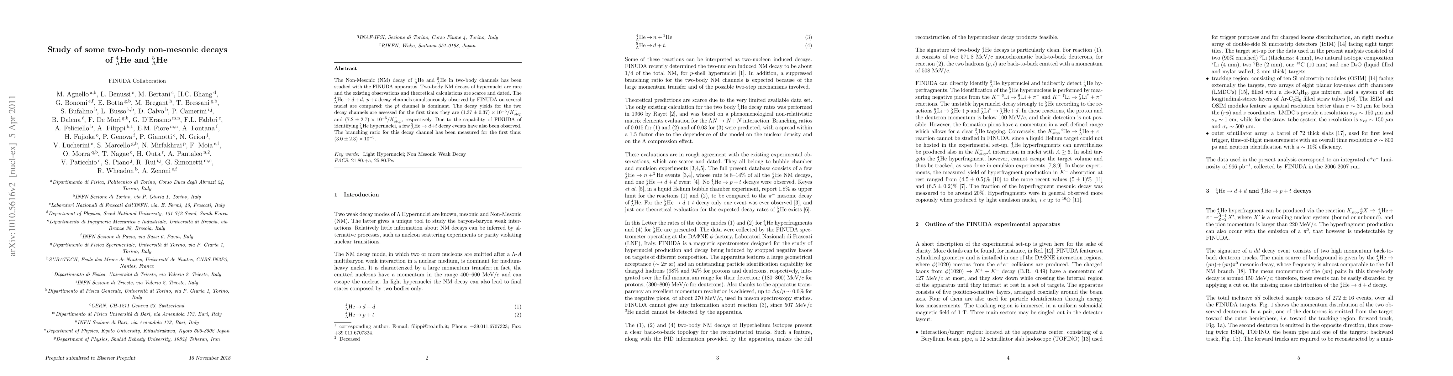 The FINUDA Collaboration studied two-body non-mesonic decays of $^4_\Lambda$He and $^5_\Lambda$He, finding the $p+t$ channel dominant for $^4_\Lambda$He with yields of $(8.3\pm 1.0)\times 10^{-5}/K^-_{stop}$. For $^5_\Lambda$He, a few $d+t$ decay events were observed, yielding a first-time branching ratio of $(3.0\pm 2.3)\times 10^{-3}$.