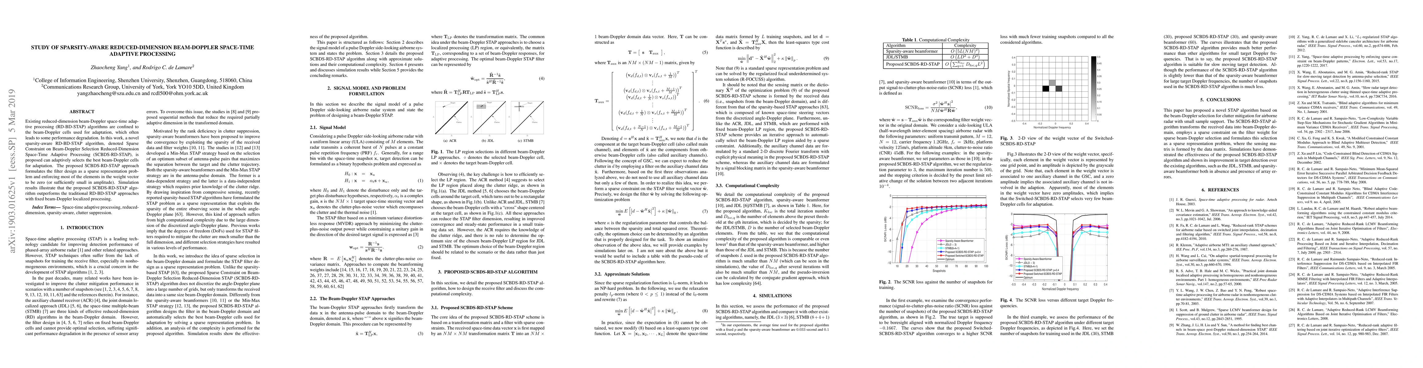 This paper proposes a novel sparsity-aware reduced-dimension beam-Doppler space-time adaptive processing (SCBDS-RD-STAP) algorithm that adaptively selects optimal beam-Doppler cells, outperforming traditional fixed localized processing methods. Simulation results show significant performance improvements.