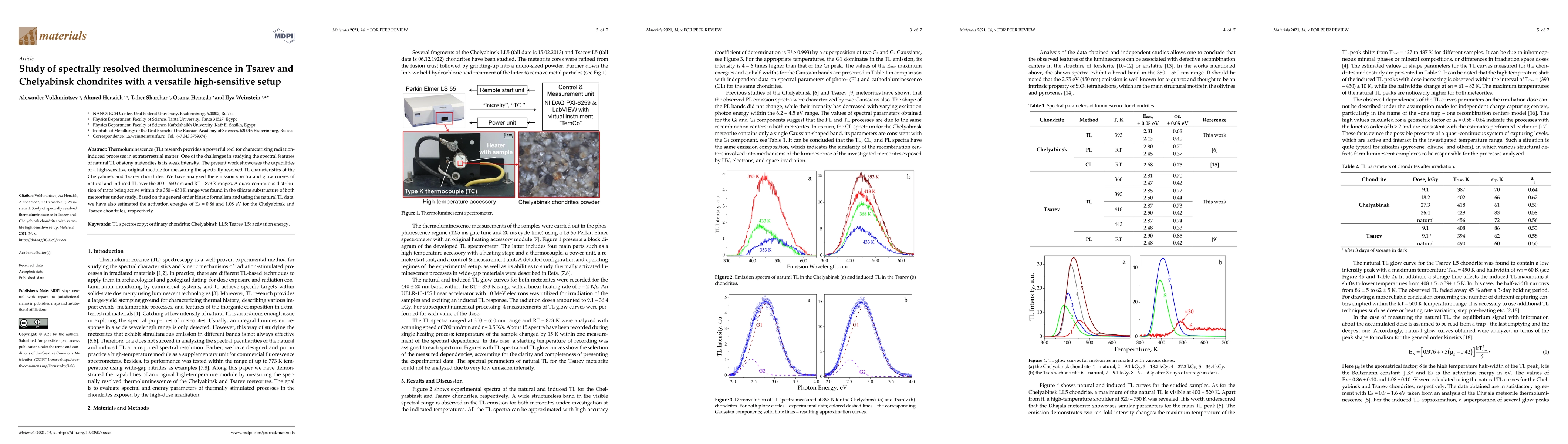 Thermoluminescence (TL) research provides a powerful tool for characterizing radiation-induced processes in extraterrestrial matter. One of the challenges in studying the spectral features of the natural TL of stony meteorites is its weak intensity. The present work showcases the capabilities of a high-sensitive original module for measuring the spectrally resolved TL characteristics of the Chelyabinsk and Tsarev chondrites. We have analyzed the emission spectra and glow curves of natural and induced TL over the 300 - 650 nm and RT - 873 K ranges. A quasi-continuous distribution of traps active within the 350 - 650 K range was found in the silicate substructure of both meteorites under study. Based on the general order kinetic formalism and using the natural TL data, we also estimated the activation energies of 0.86 and 1.08 eV for the Chelyabinsk and Tsarev chondrites, respectively.