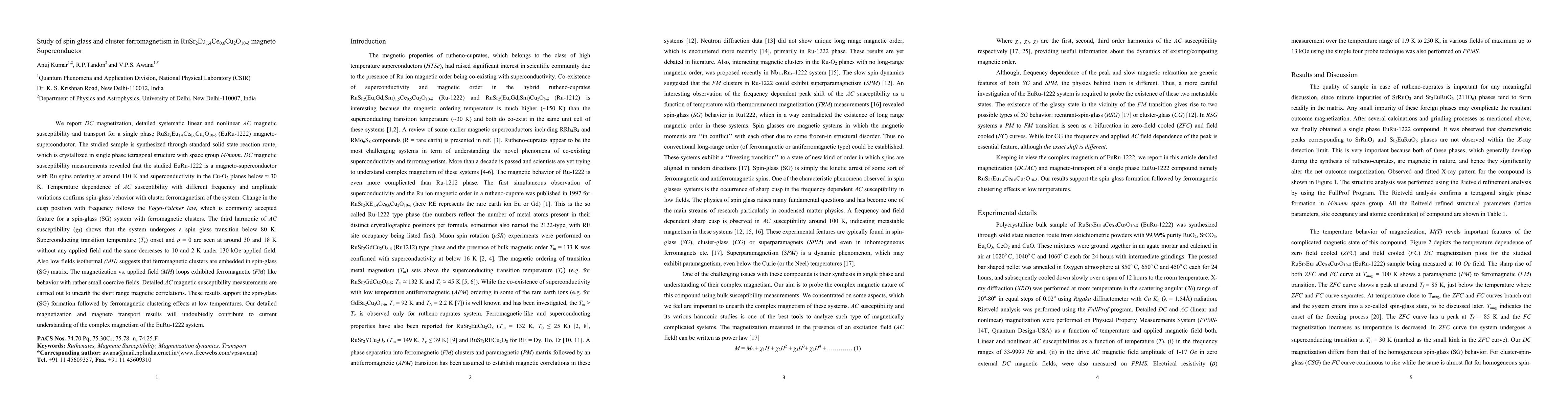 We report DC magnetization, detailed systematic linear and nonlinear AC magnetic susceptibility and transport for a single phase RuSr2Eu1.4Ce0.6Cu2O10-{\delta} (EuRu-1222) magneto-superconductor. The studied sample is synthesized through standard solid state reaction route, which is crystallized in single phase tetragonal structure with space group I4/mmm. DC magnetic susceptibility measurements revealed that the studied EuRu-1222 is a magneto-superconductor with Ru spins ordering at around 110 K and superconductivity in the Cu-O2 planes below \approx 30 K. Temperature dependence of AC susceptibility with different frequency and amplitude variations confirms spin-glass behavior with cluster ferromagnetism of the system. Change in the cusp position with frequency follows the Vogel-Fulcher law, which is commonly accepted feature for a spin-glass (SG) system with ferromagnetic clusters. The third harmonic of AC susceptibility (\c{hi}3) shows that the system undergoes a spin glass transition below 80 K. Superconducting transition temperature (Tc) onset and {\rho} = 0 are seen at around 30 and 18 K without any applied field and the same decreases to 10 and 2 K under 130 kOe applied field. Also low fields isothermal (MH) suggests that ferromagnetic clusters are embedded in spin-glass (SG) matrix. The magnetization vs. applied field (MH) loops exhibited ferromagnetic (FM) like behavior with rather small coercive fields. Detailed AC magnetic susceptibility measurements are carried out to unearth the short range magnetic correlations. These results support the spin-glass (SG) formation followed by ferromagnetic clustering effects at low temperatures. Our detailed magnetization and magneto transport results will undoubtedly contribute to current understanding of the complex magnetism of the EuRu-1222 system.