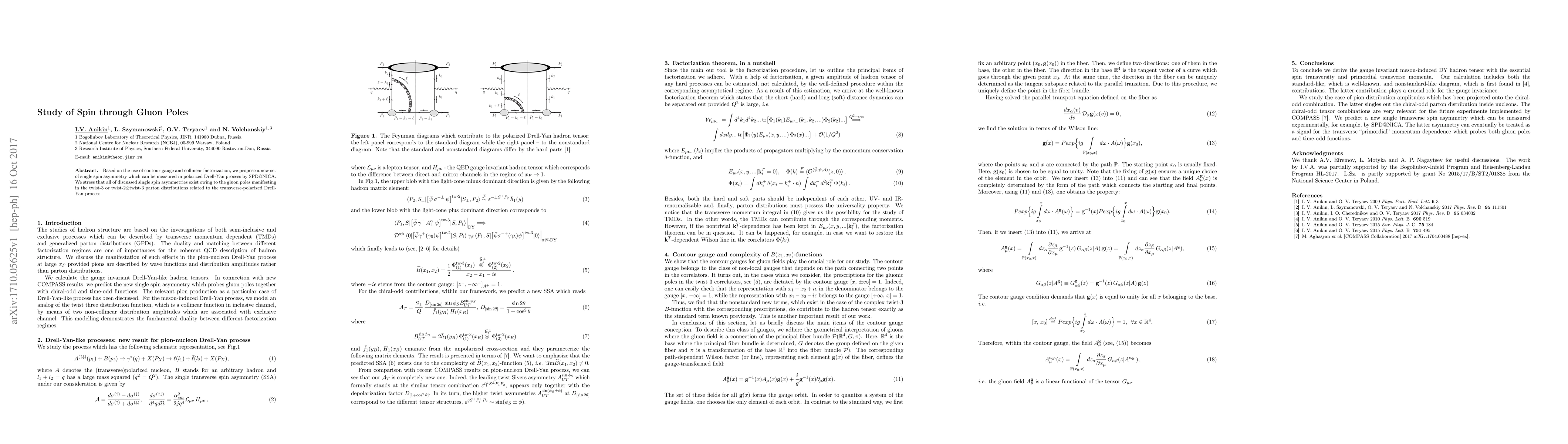 Based on the use of contour gauge and collinear factorization, we propose a new set of single spin asymmetry which can be measured in polarized Drell-Yan process by SPD@NICA. We stress that the discussed single transverse spin asymmetries exist owing to the gluon poles manifesting in the twist-3 or twist-2$\otimes$twist-3 parton distributions related to the transverse-polarized Drell-Yan process.