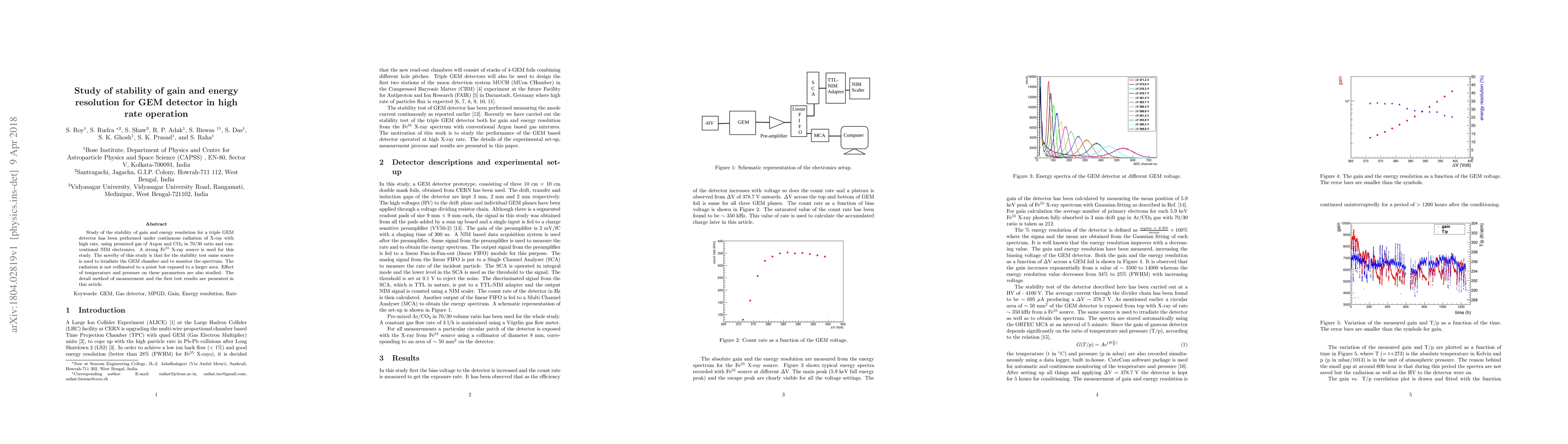 Researchers studied the stability of a triple GEM detector's gain and energy resolution under continuous X-ray exposure at high rates, finding that temperature and pressure affect these parameters.