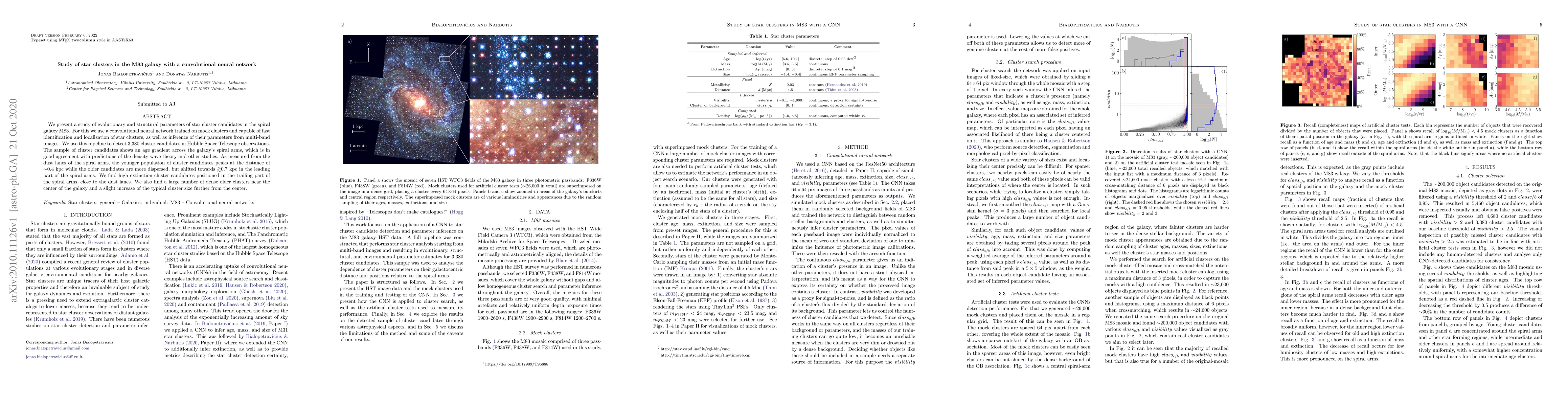 We present a study of evolutionary and structural parameters of star cluster candidates in the spiral galaxy M83. For this we use a convolutional neural network trained on mock clusters and capable of fast identification and localization of star clusters, as well as inference of their parameters from multi-band images. We use this pipeline to detect 3,380 cluster candidates in Hubble Space Telescope observations. The sample of cluster candidates shows an age gradient across the galaxy's spiral arms, which is in good agreement with predictions of the density wave theory and other studies. As measured from the dust lanes of the spiral arms, the younger population of cluster candidates peaks at the distance of $\sim$0.4 kpc while the older candidates are more dispersed, but shifted towards $\gtrsim$0.7 kpc in the leading part of the spiral arms. We find high extinction cluster candidates positioned in the trailing part of the spiral arms, close to the dust lanes. We also find a large number of dense older clusters near the center of the galaxy and a slight increase of the typical cluster size further from the center.