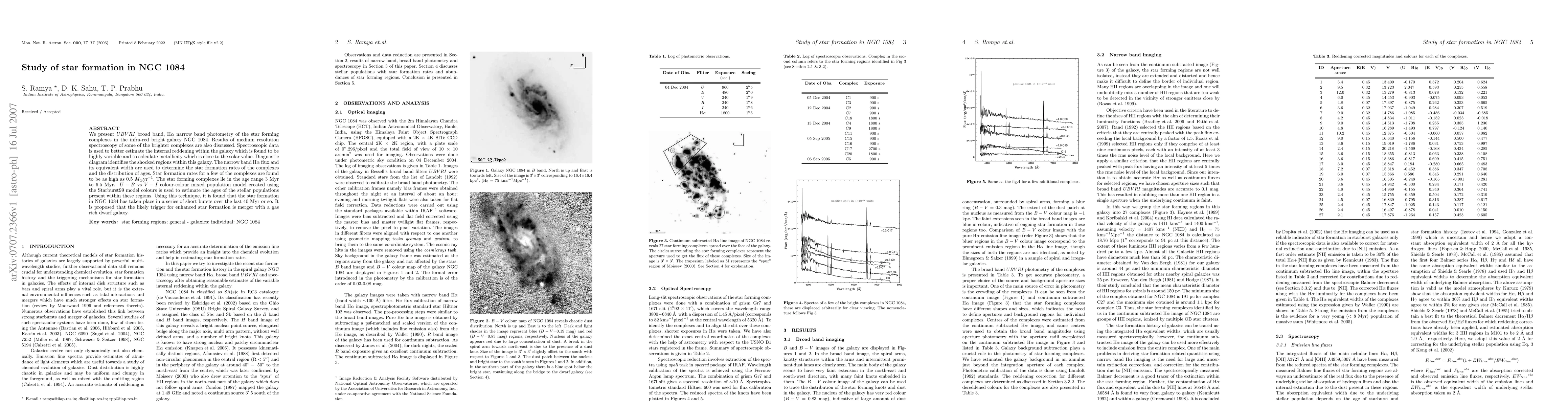 We present UBVRI broad band, H$\alpha$ narrow band photometry of the star forming complexes in the infra-red bright galaxy NGC 1084. Results of medium resolution spectroscopy of some of the brighter complexes are also discussed. Spectroscopic data is used to better estimate the internal reddening within the galaxy which is found to be highly variable and to calculate metallicity which is close to the solar value. Diagnostic diagram identifies the shocked regions within this galaxy. The narrow band H$\alpha$ flux and its equivalent width are used to determine the star formation rates of the complexes and the distribution of ages. Star formation rates for a few of the complexes are found to be as high as 0.5 $M_{\odot}$/year. The star forming complexes lie in the age range 3 Myr to 6.5 Myr. U-B vs V-I colour-colour mixed population model created using the Starburst99 model colours is used to estimate the ages of the stellar populations present within these regions. Using this technique, it is found that the star formation in NGC 1084 has taken place in a series of short bursts over the last 40 Myr or so. It is proposed that the likely trigger for enhanced star formation is merger with a gas rich dwarf galaxy.