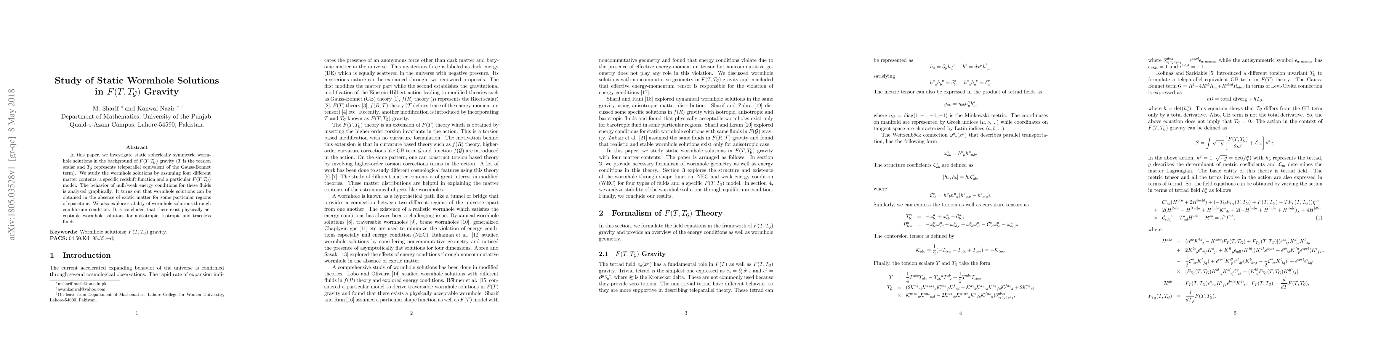 This paper explores static spherically symmetric wormhole solutions in $F(T,T_\mathcal{G})$ gravity, revealing that wormholes can exist without exotic matter under specific conditions. Stability analysis indicates physically viable wormhole solutions for various fluid types.
