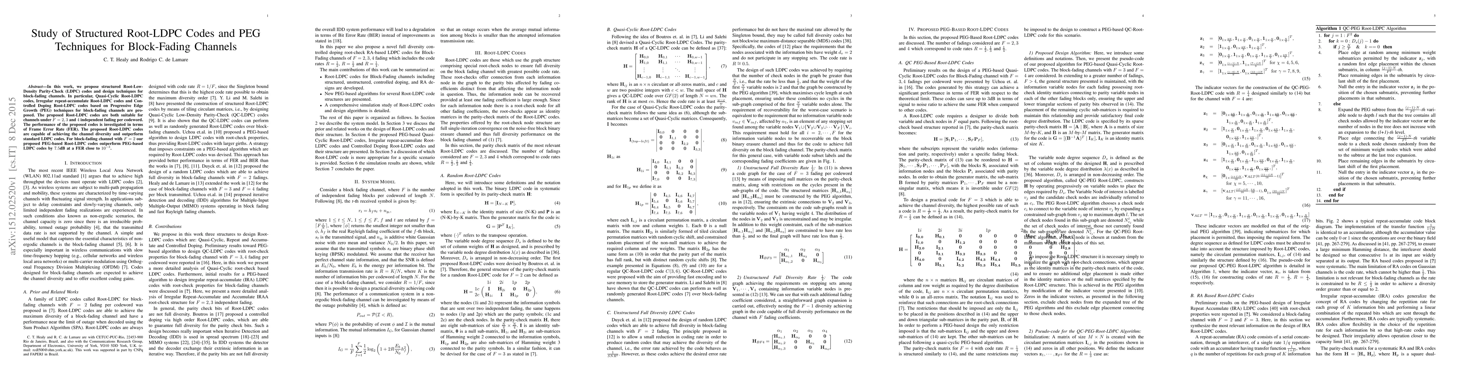 This paper proposes structured Root-LDPC codes and Progressive Edge Growth (PEG) techniques for block-fading channels, achieving superior performance compared to standard LDPC codes, especially for channels with up to four independent fading per codeword. The study demonstrates a significant improvement in Frame Error Rate (FER) performance.