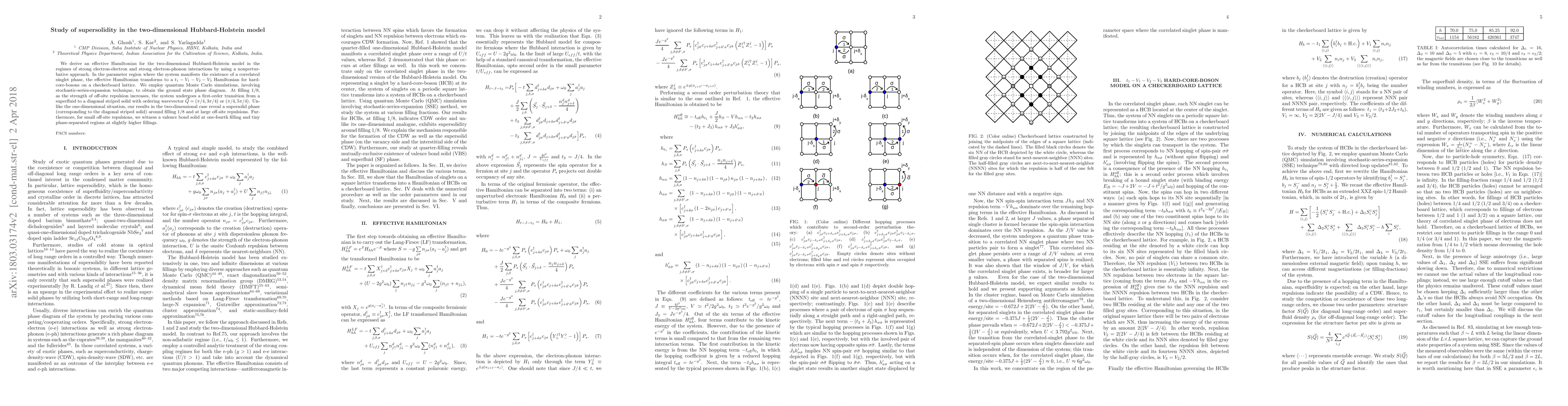We derive an effective Hamiltonian for the two-dimensional Hubbard-Holstein model in the regimes of strong electron-electron and strong electron-phonon interactions by using a nonperturbative approach. In the parameter region where the system manifests the existence of a correlated singlet phase, the effective Hamiltonian transforms to a $t_1-V_1-V_2-V_3$ Hamiltonian for hard-core-bosons on a checkerboard lattice. We employ quantum Monte Carlo simulations, involving stochastic-series-expansion technique, to obtain the ground state phase diagram. At filling $1/8$, as the strength of off-site repulsion increases, the system undergoes a first-order transition from a superfluid to a diagonal striped solid with ordering wavevector $\vec{Q}=(\pi/4,3\pi/4)$ or $(\pi/4,5\pi/4)$. Unlike the one-dimensional situation, our results in the two-dimensional case reveal a supersolid phase (corresponding to the diagonal striped solid) around filling $1/8$ and at large off-site repulsions. Furthermore, for small off-site repulsions, we witness a valence bond solid at one-fourth filling and tiny phase-separated regions at slightly higher fillings.