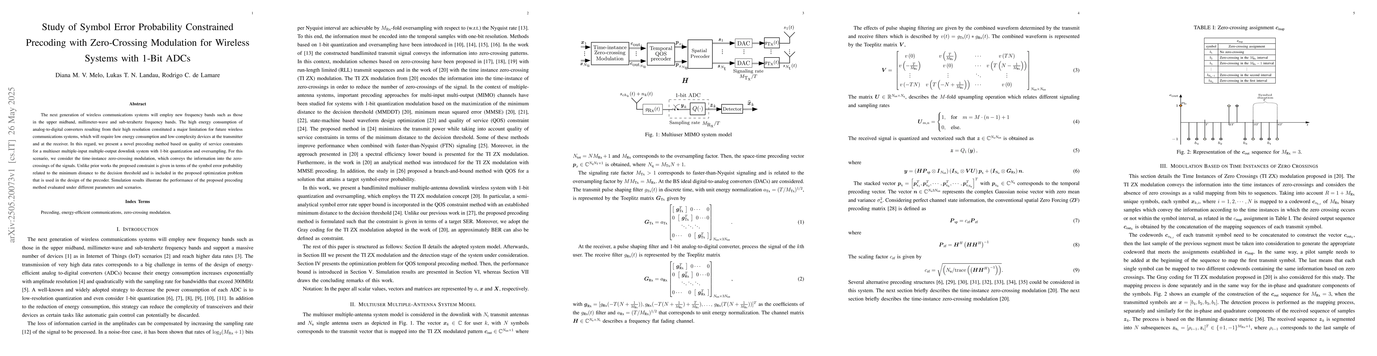 The paper introduces a novel precoding technique that incorporates symbol error probability constraints in the optimization problem for 1-bit quantized systems using zero-crossing modulation.