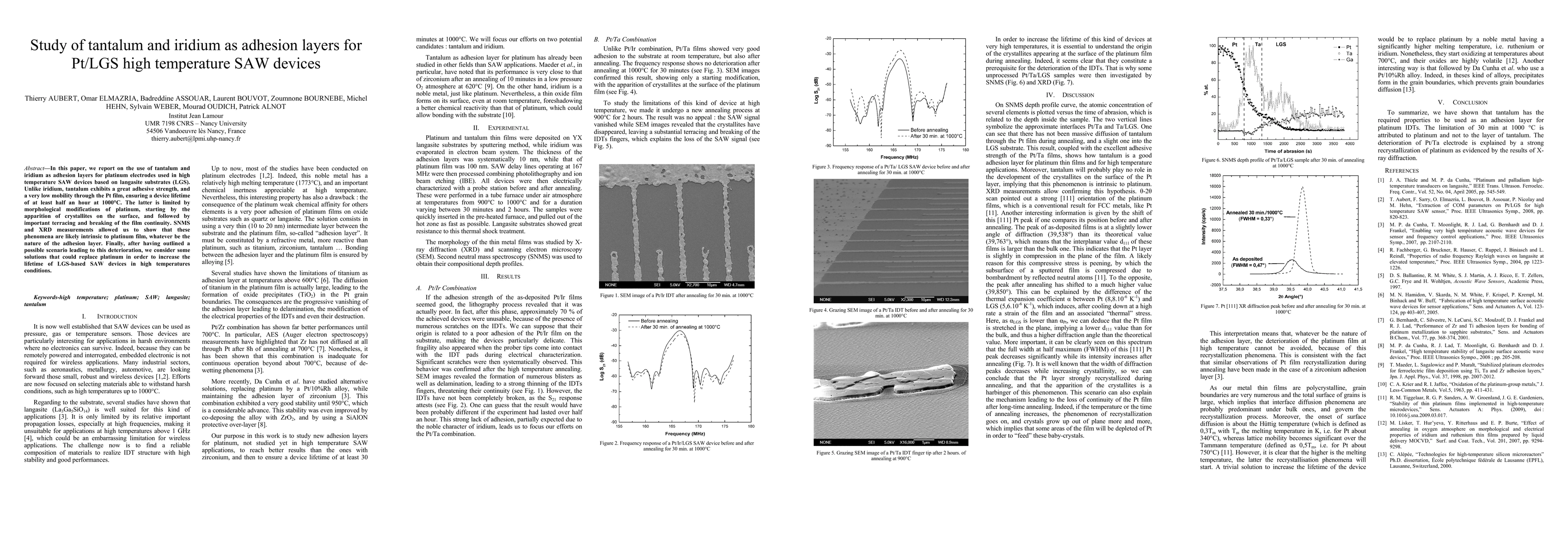 This study investigates tantalum and iridium as adhesion layers for platinum electrodes in high-temperature SAW devices on langasite substrates, finding tantalum to provide superior adhesive strength and longevity at 1000°C. Despite this, platinum films still degrade due to intrinsic morphological changes, prompting consideration of alternative materials to enhance device longevity.