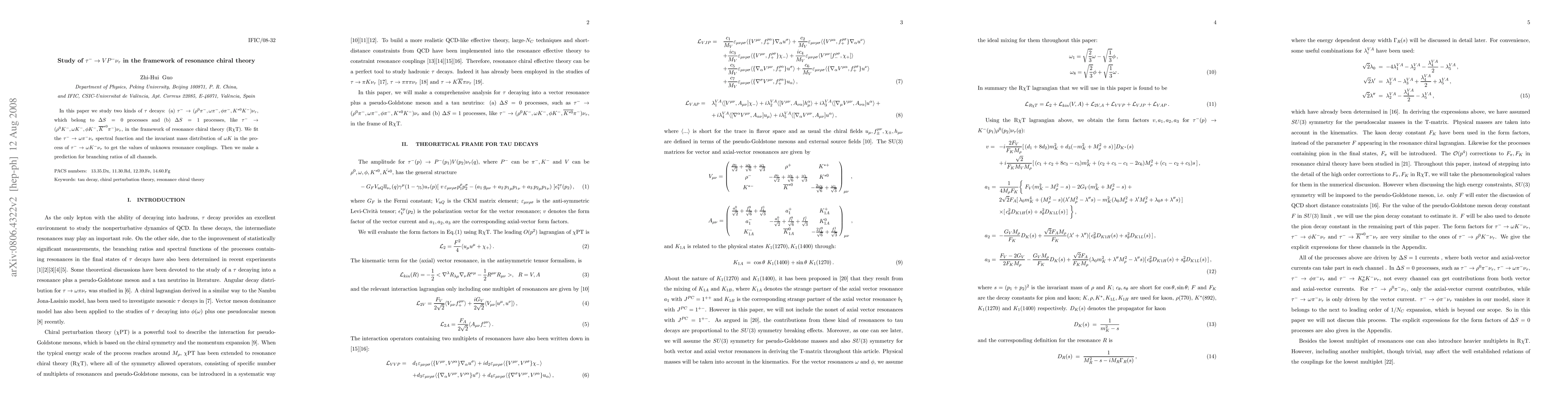 In this paper we study two kinds of tau decays: (a) tau- --> (rho pi-,omega pi-, phi pi-, K*0 K-) nu(tau), which belong to Delta S=0 processes and (b) Delta S = 1 processes, like tau- --> (rho K-, omega K-, phi K-, \bar{K*0} pi-) nu(tau), in the framework of resonance chiral theory. We fit the tau- --> omega pi- nu(tau) spectral function and the invariant mass distribution of omega K in the process of tau- --> omega K- nu(tau) to get the values of unknown resonance couplings. Then we make a prediction for branching ratios of all channels.