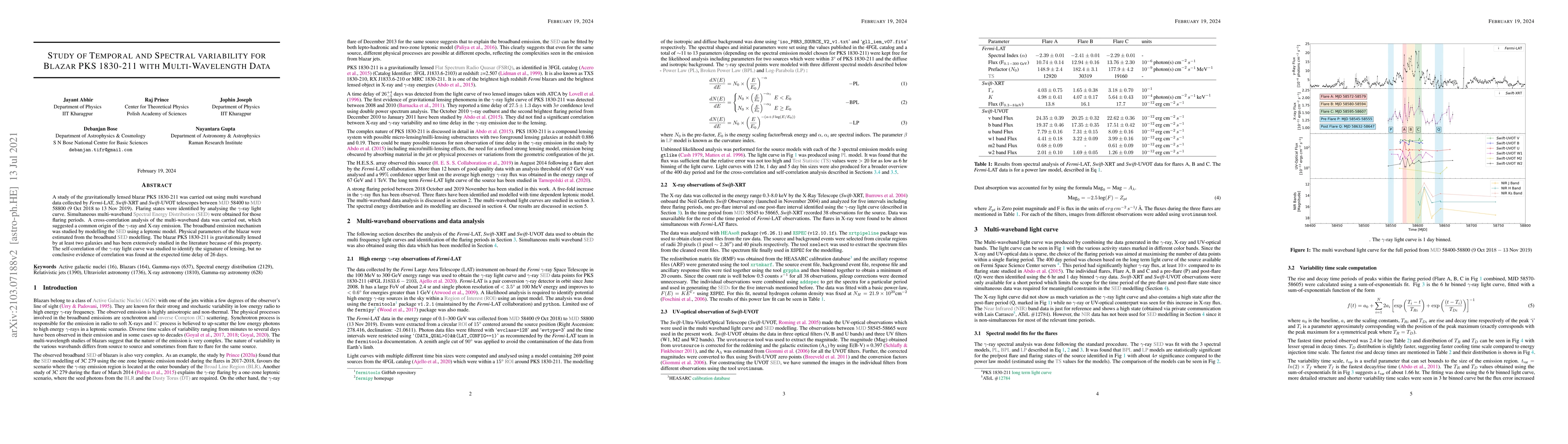 A study of the gravitationally lensed blazar PKS 1830-211 was carried out using multi waveband data collected by Fermi-LAT, Swift-XRT and Swift-UVOT telescopes between MJD 58400 to MJD 58800 (9 Oct 2018 to 13 Nov 2019). Flaring states were identified by analysing the gamma-ray light curve. Simultaneous multi-waveband SED were obtained for those flaring periods. A cross-correlation analysis of the multi-waveband data was carried out, which suggested a common origin of the gamma-ray and X-ray emission. The broadband emission mechanism was studied by modelling the SED using a leptonic model. Physical parameters of the blazar were estimated from the broadband SED modelling. The blazar PKS 1830-211 is gravitationally lensed by at least two galaxies and has been extensively studied in the literature because of this property. The self-correlation of the gamma-ray light curve was studied to identify the signature of lensing, but no conclusive evidence of correlation was found at the expected time delay of 26 days.