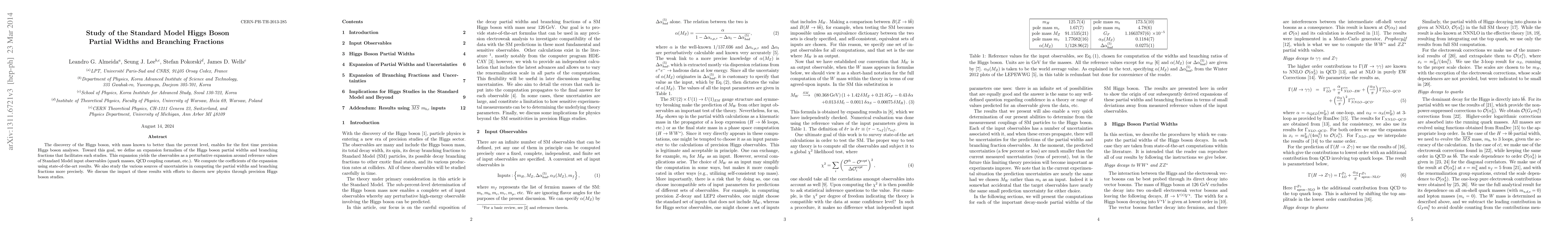 This research introduces a formalism to precisely calculate the 125 GeV Standard Model Higgs Boson's partial widths and branching fractions as a perturbative expansion around reference Standard Model input values. It also examines sources of uncertainties and discusses implications for detecting new physics through precise Higgs boson studies.