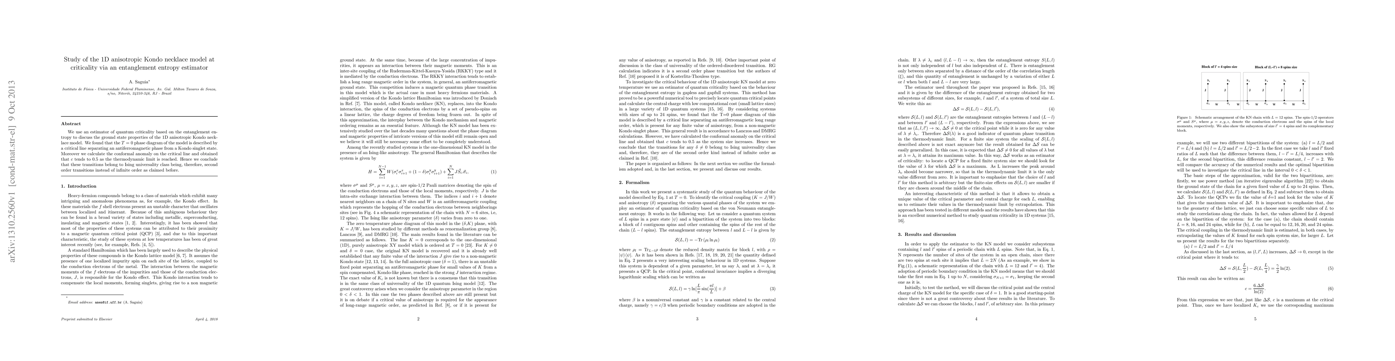 We use an estimator of quantum criticality based on the entanglement entropy to discuss the ground state properties of the 1D anisotropic Kondo necklace model. We found that the T=0 phase diagram of the model is described by a critical line separating an antiferromagnetic phase from a Kondo singlet state. Moreover we calculate the conformal anomaly on the critical line and obtained that c tends to 0.5 as the thermodynamic limit is reached. We conclude that these transitions belong to Ising universality class being, therefore, second order transitions instead of infinite order as claimed before.