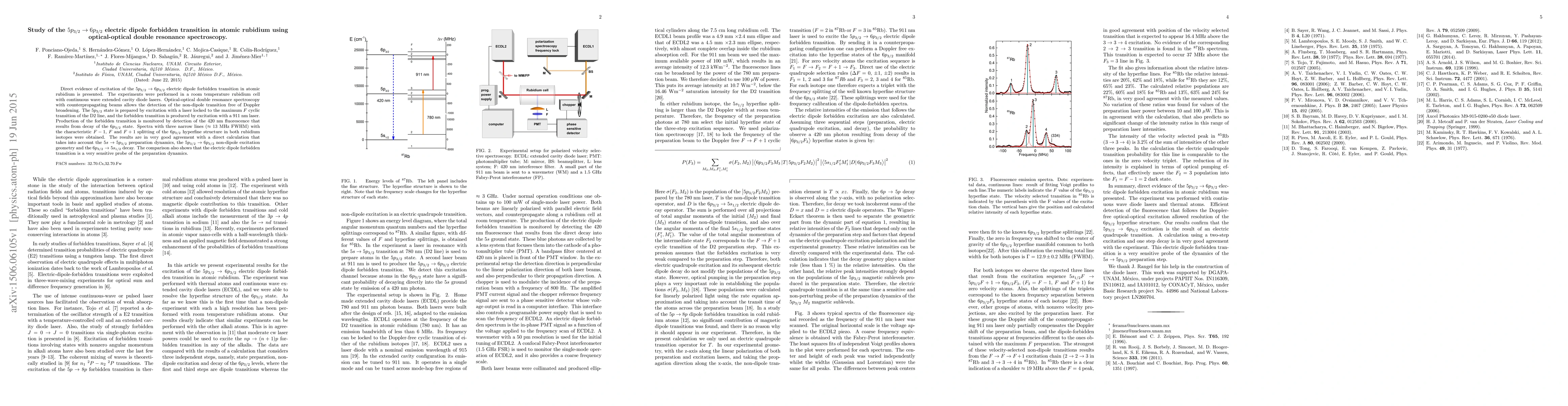 Direct evidence of excitation of the 5p3/2 -> 6p3/2 electric dipole forbidden transition in atomic rubidium is presented. The experiments were performed in a room temperature rubidium cell with continuous wave extended cavity diode lasers. Optical-optical double resonance spectroscopy with counterpropagating beams allows the detection of the non-dipole transition free of Doppler broadening. The 5p3/2 state is prepared by excitation with a laser locked to the maximum F cyclic transition of the D2 line, and the forbidden transition is produced by excitation with a 911 nm laser. Production of the forbidden transition is monitored by detection of the 420 nm fluorescence that results from decay of the 6p3/2 state. Spectra with three narrow lines (~ 13 MHz FWHM) with the characteristic F - 1, F and F + 1 splitting of the 6p3/2 hyperfine structure in both rubidium isotopes were obtained. The results are in very good agreement with a direct calculation that takes into account the 5s -> 5p3/2 preparation dynamics, the 5p3/2 -> 6p3/2 non-dipole excitation geometry and the 6p3/2 -> 5s1/2 decay. The comparison also shows that the electric dipole forbidden transition is a very sensitive probe of the preparation dynamics.