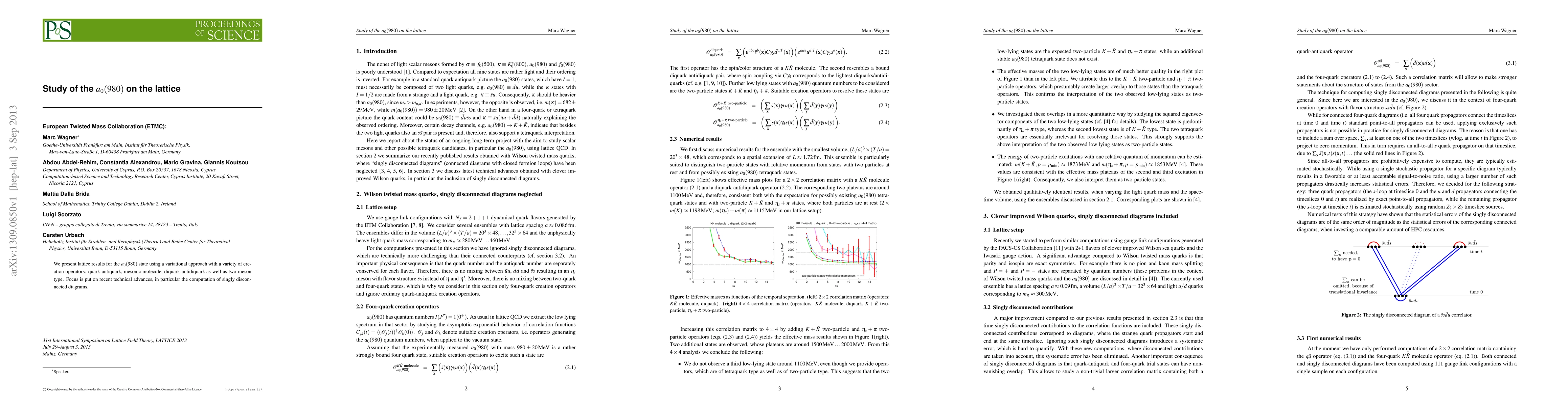 We present lattice results for the a_0(980) state using a variational approach with a variety of creation operators: quark-antiquark, mesonic molecule, diquark-antidiquark as well as two-meson type. Focus is put on recent technical advances, in particular the computation of singly disconnected diagrams.