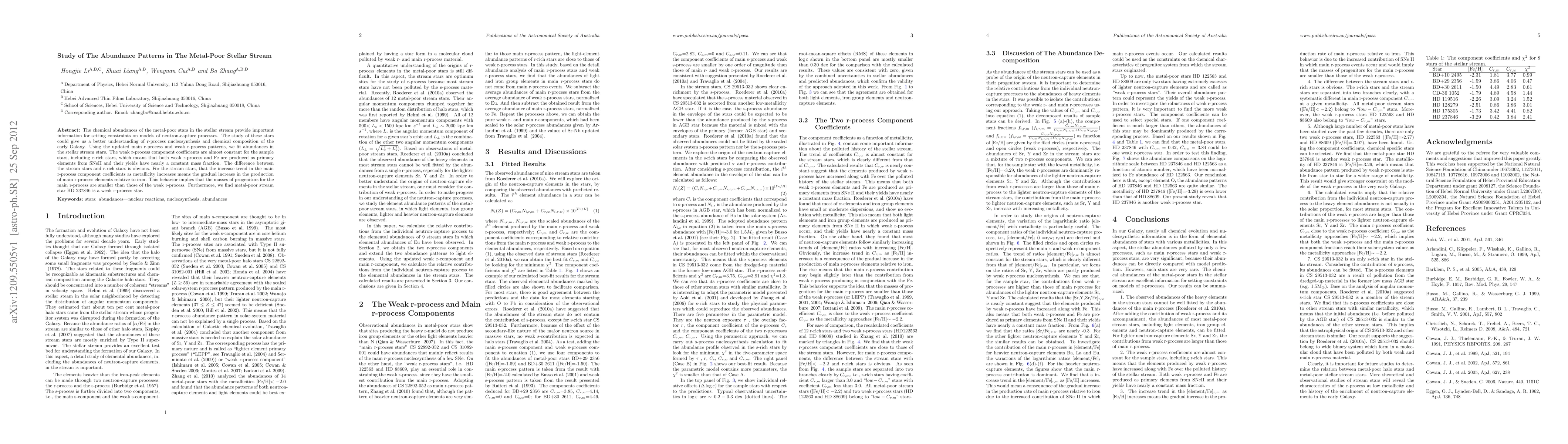 The chemical abundances of the metal-poor stars in the stellar stream provide important information for setting constraints on models of neutron-capture processes. The study of these stars could give us a better understanding of r-process nucleosynthesis and chemical composition of the early Galaxy. Using the updated main r-process and weak r-process patterns, we fit abundances in the stellar stream stars. The weak r-process component coefficients are almost constant for the sample stars, including r-rich stars, which means that both weak r-process and Fe are produced as primary elements from SNeII and their yields have nearly a constant mass fraction. The difference between the stream stars and r-rich stars is obvious. For the stream stars, that the increase trend in the main r-process component coefficients as metallicity increases means the gradual increase in the production of main r-process elements relative to iron. This behavior implies that the masses of progenitors for the main r-process are smaller than those of the weak r-process. Furthermore, we find metal-poor stream star HD 237846 is a weak r-process star.