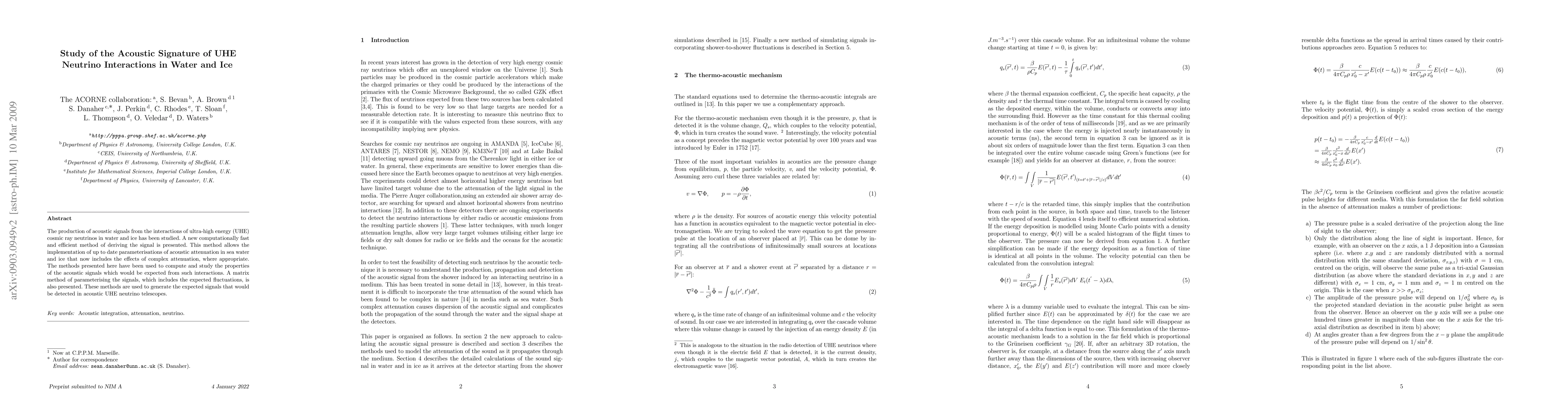 This study investigates the acoustic signatures produced by ultra-high energy neutrino interactions in water and ice, employing a new efficient computational method. The research includes updated parameterizations for acoustic attenuation, generating expected signals for detection in acoustic UHE neutrino telescopes.