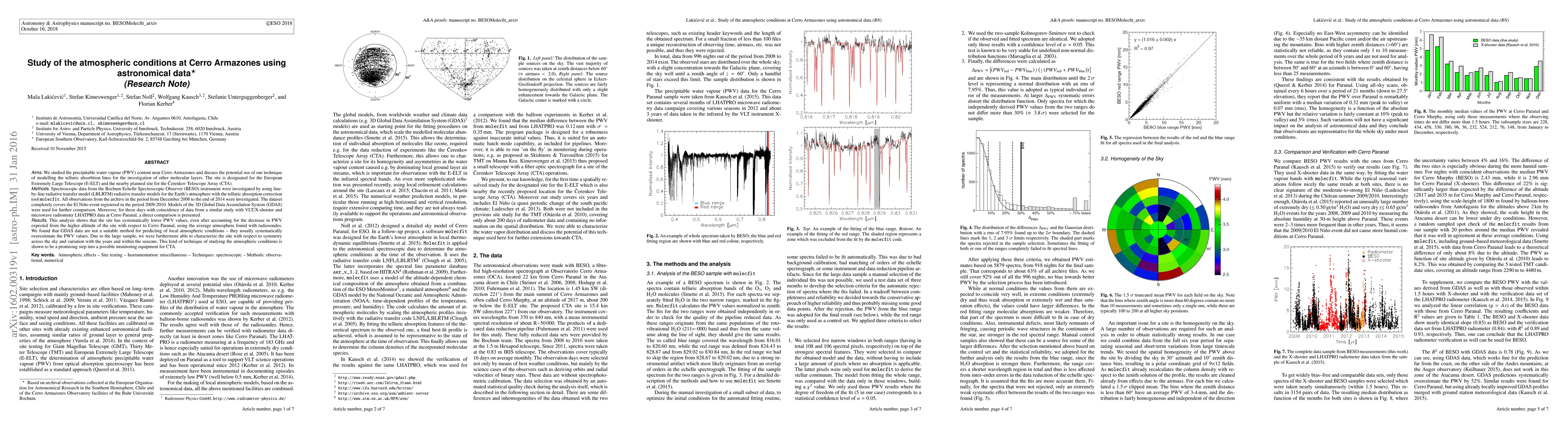 This study analyzed atmospheric conditions at Cerro Armazones, finding it has lower precipitable water vapor (PWV) than Cerro Paranal, even accounting for its higher altitude. The research utilized spectroscopic data from BESO, radiative transfer models, and molecfit for telluric absorption correction. It concluded that Global Data Assimilation System (GDAS) models overestimate PWV and suggested this method could be useful for monitoring the Cherenkov Telescope Array (CTA).