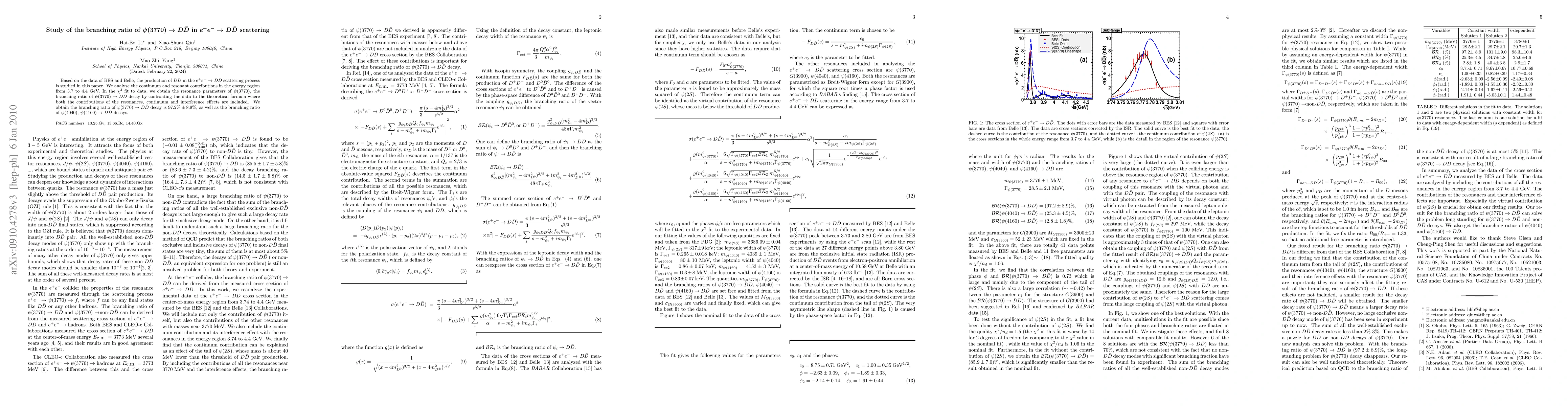 Researchers analyzed data from BES and Belle experiments to study the branching ratio of the $ heta(3770)$ meson decaying into $Dar{D}$ pairs in high-energy electron-positron collisions, yielding a 97.2% decay rate.