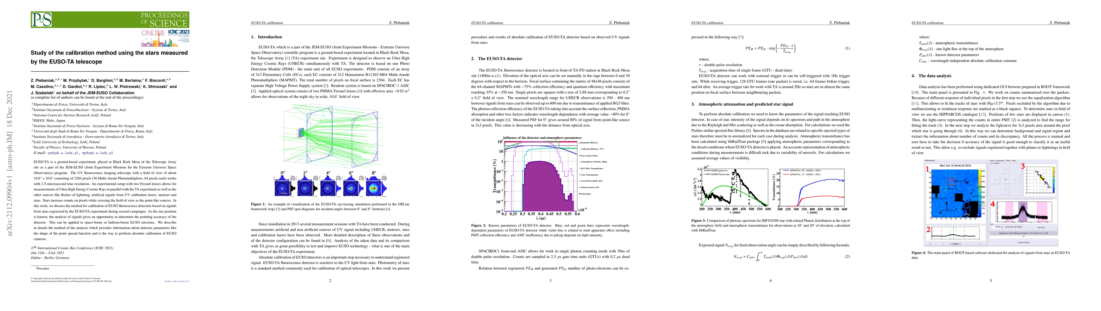 EUSO-TA is a ground-based experiment, placed at Black Rock Mesa of the Telescope Array site as a part of the JEM-EUSO (Joint Experiment Missions for the Extreme Universe Space Observatory) program. The UV fluorescence imaging telescope with a field of view of about 10.6 deg x 10.6 deg consisting of 2304 pixels (36 Multi-Anode Photomultipliers, 64 pixels each) works with 2.5-microsecond time resolution. An experimental setup with two Fresnel lenses allows for measurements of Ultra High Energy Cosmic Rays in parallel with the TA experiment as well as the other sources like flashes of lightning, artificial signals from UV calibration lasers, meteors and stars. Stars increase counts on pixels while crossing the field of view as the point-like sources. In this work, we discuss the method for calibration of EUSO fluorescence detectors based on signals from stars registered by the EUSO-TA experiment during several campaigns. As the star position is known, the analysis of signals gives an opportunity to determine the pointing accuracy of the detector. This can be applied to space-borne or balloon-borne EUSO missions. We describe in details the method of the analysis which provides information about detector parameters like the shape of the point spread function and is the way to perform absolute calibration of EUSO cameras.